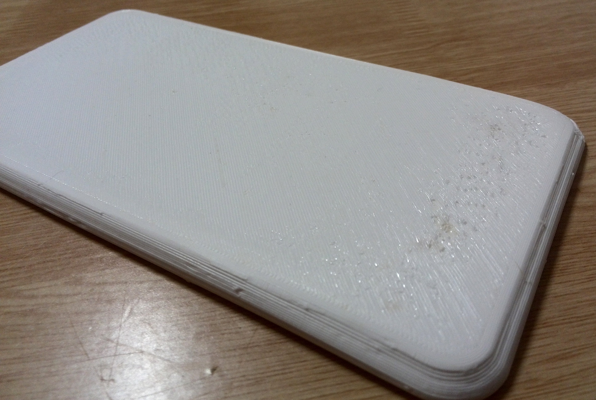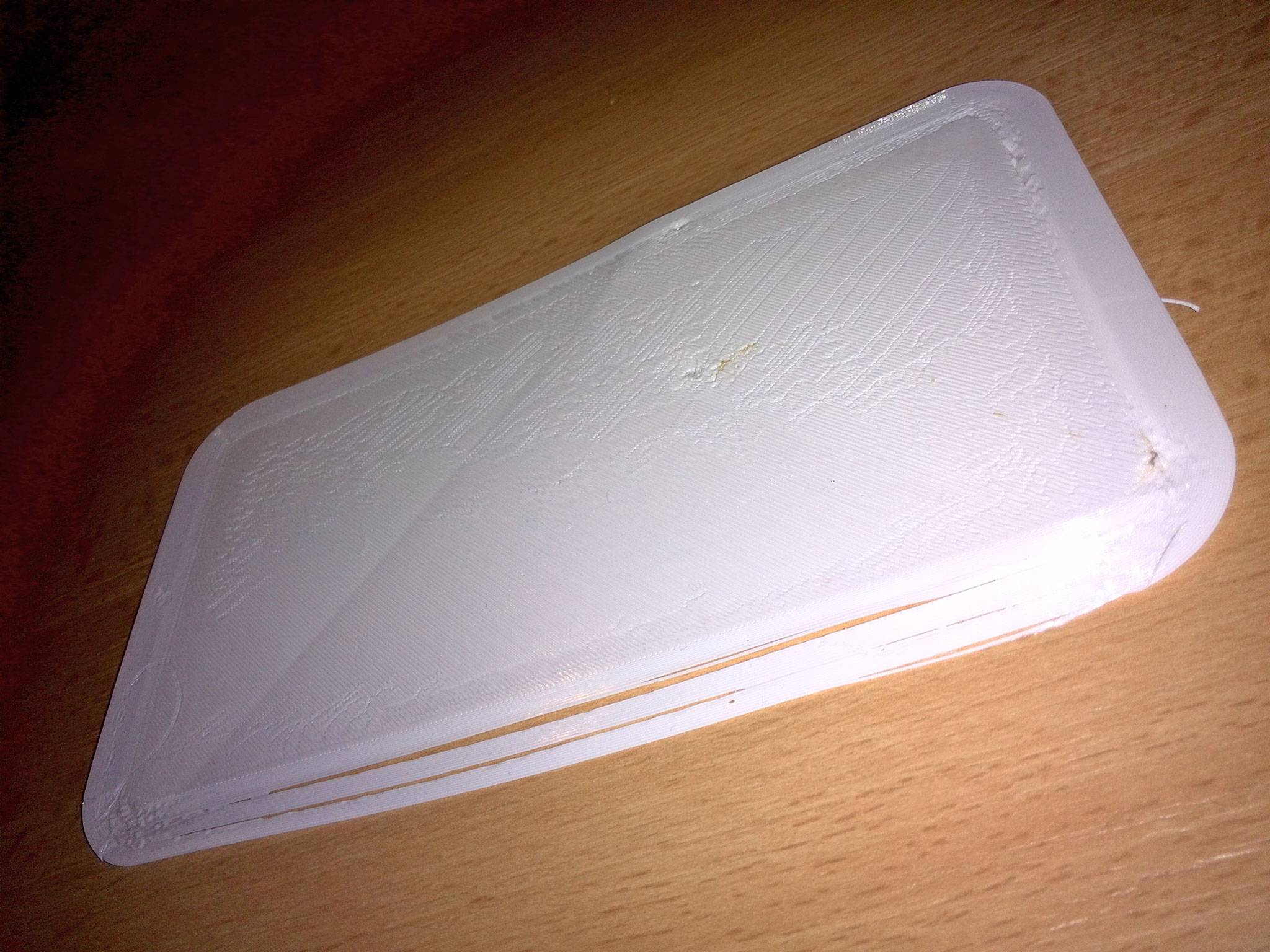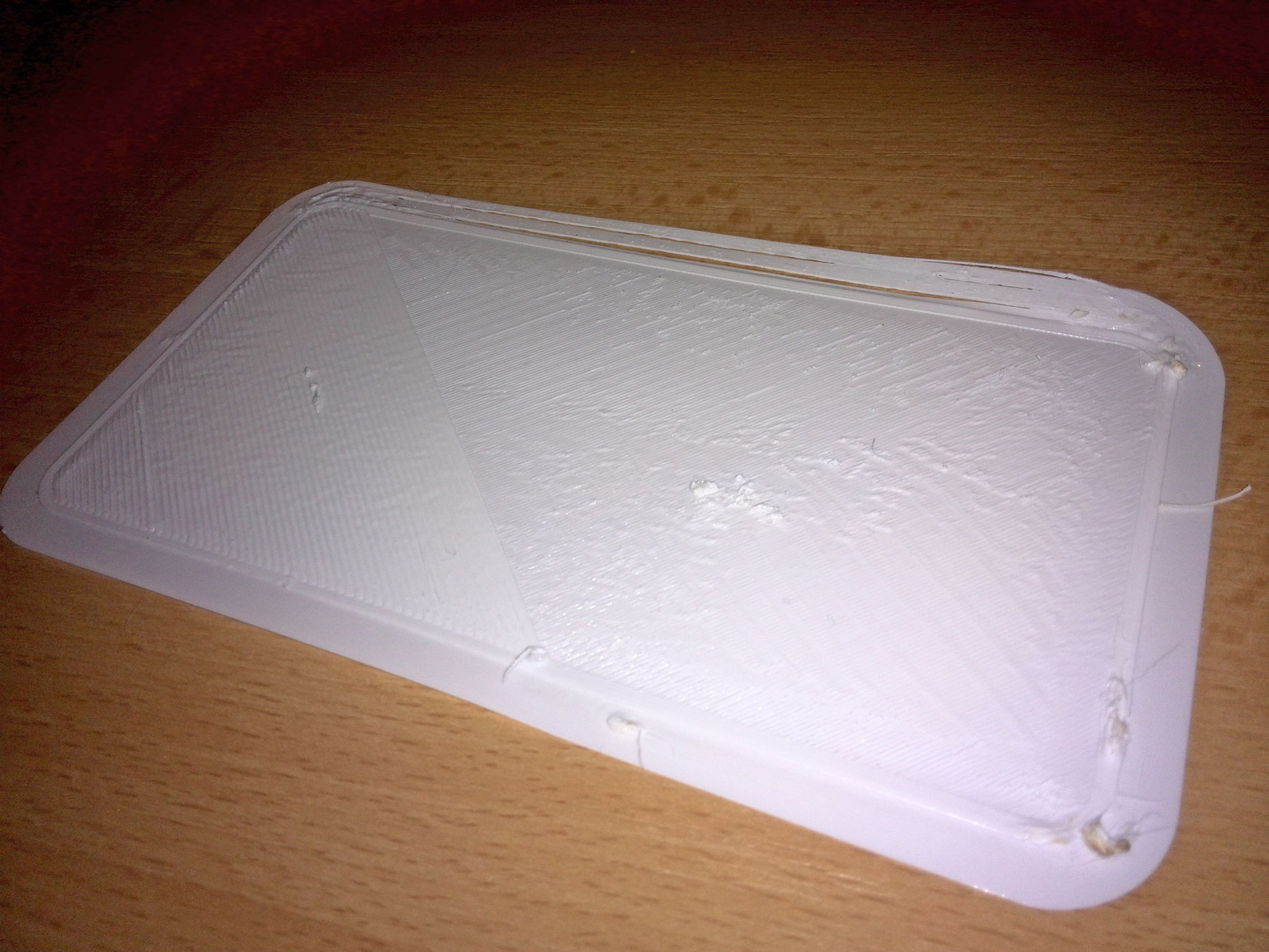 Zkušební tisk první a kousek druhé vrstvy se zdaleka nedá označit za dokonale ukázkový (PETG má tendenci se matlat na trysku a pak nalepovat na ty nejnevhodnější místa během tisku), ale po dlouhé době je to aspoň poprvé, kdy se mi přichytila první vrstva téměř komplet - až na pravý horní roh, kde se mi to zvedlo a v celé horní části docházelo k odtrhávání při tisku skirtu.