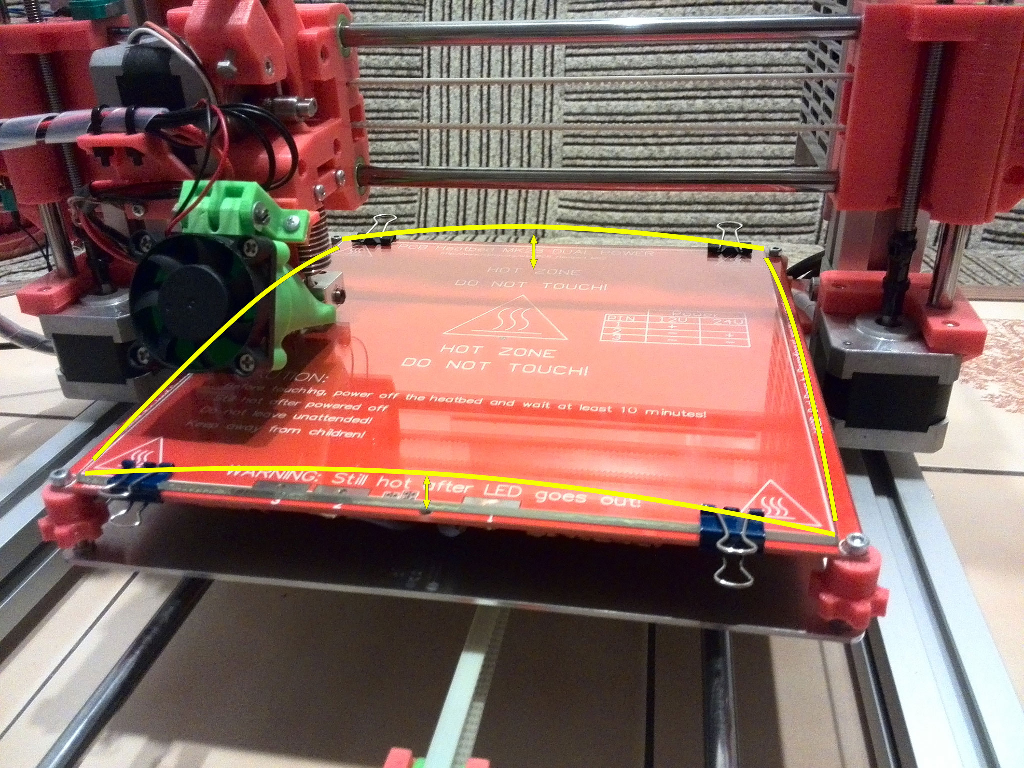 Co se týče těch šroubů, tak jsem v heatbedu všechny čtyři otvory nepatrně zvětšil vrtákem, takže tam vůle jsou... Nemyslím si, že by se to v ose X tlačilo k sobě a bed se kvůli tomu prohýbal uprostřed směrem nahoru...