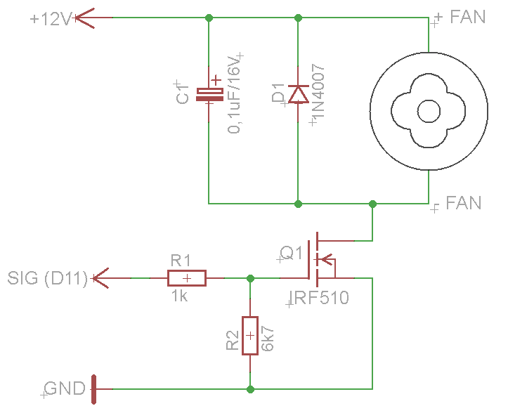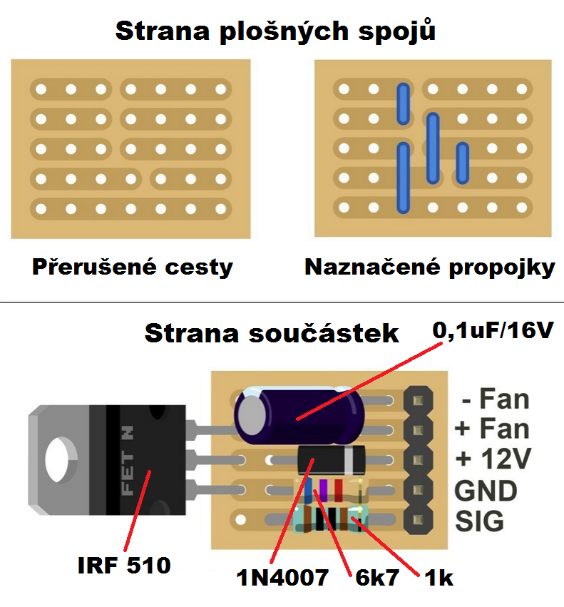 1) Stavba spínače: Lehce jsem změnil součástky spínače podle šuplíkových zásob. Oproti původnímu zapojení jsem změnil diodu 1N4001 na 1N4007. Obě jsou na stejný proud, pouze mnou použitá je na vyšší napětí, což nevadí. Druhou změnou je použití MOSFETu IRF510 místo IRF540. V podstatě jsou stejné, mnou použitý je na nižší proud 5,6A, což je pro ventilátor více než dost :) . Veškeré změny, popisy součástek a propojení s Ramps najdete na přiložených obrázcích. Jen poznámka ke kondenzátoru, na obrázku mám uvedeno 0,1uF/16V. Těch 16V je minimum. Větší je lepší :D .