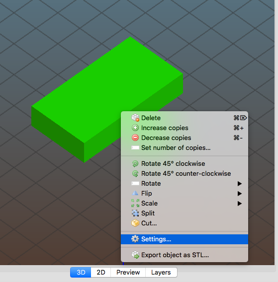 Natáhneme si do Slic3ru STL model a poté klikneme na model PTM a zvolíme Setings: