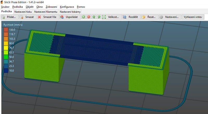 Protože mi @Tomast tady nahoře ve vlákně ukazoval, že PE slicer mosty umí, tak jsem ještě zkusil dát na desku jenom jeden můstek. No a u jediného modelu na desce PE slicer opravdu rychlost primetru u bridge správně upraví. Zkusil jsem tedy totéž u původního sliceru - a ten to taky rozřezal správně!