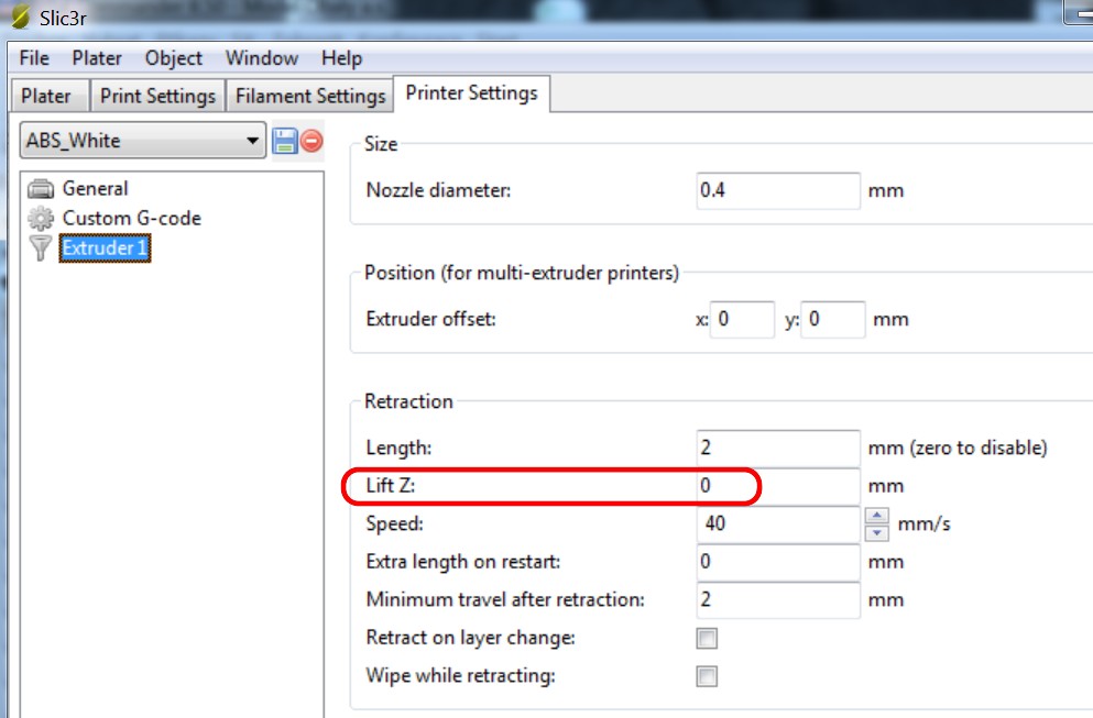 protože při přejezdu po dokončení poslední plné dolní vrstvy mi tryska zanechá stopu v pěkné ploše, chtěl jsem ji při retrakci zvednout v domnění, že po přejezdu na další pozici se hlava o danou korekci opět vrátí do původní výšky. Ovšem nestalo se tak a ani v G-kódu jsem návrat do původní pozice Z nenašel (dokonce s každou retrakcí se mi Z zvedalo o danou hodnotu nahoru).