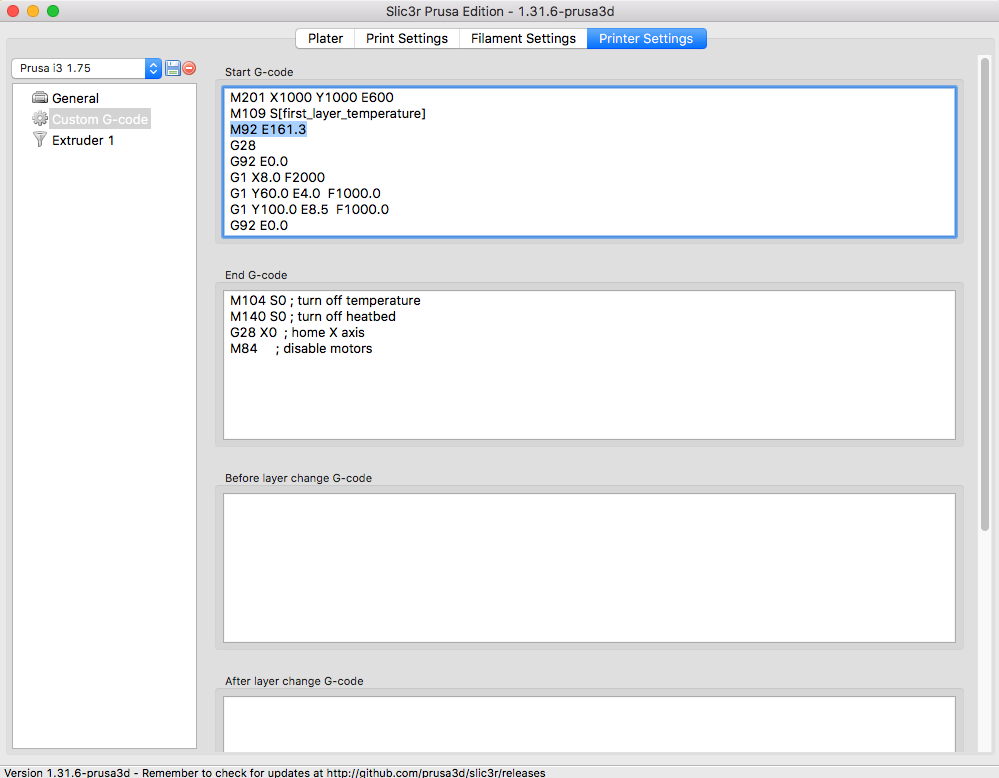 Když používáš Slic3r od Průši nepoužíváš i jeho printer settings ... on tam totiž má ve start gcode nastavení steps pro E a ty neseděj na Rebela (modře označené tam nesmíš mít, nebo upravit dle potřeby)