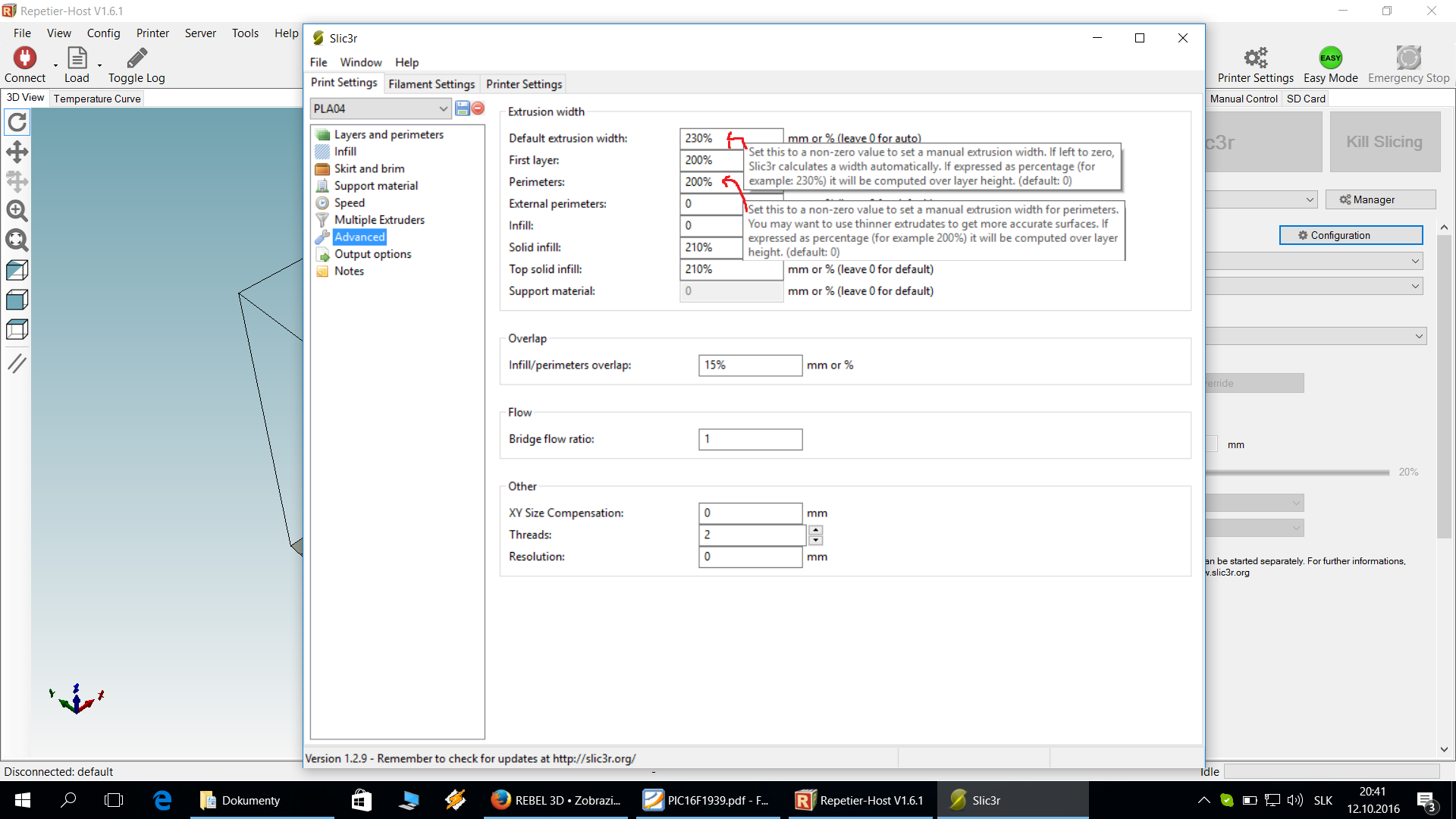 ak automaticky to nefunguje a mas trysku 0.4 by to mal mat default extrution widht 0.48mm sirka alebo 120%