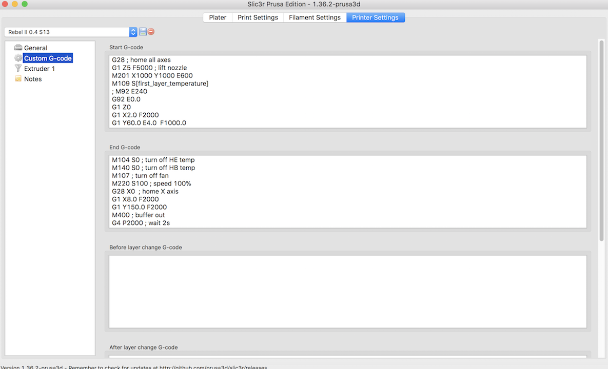 Řešení: Doporučuju nepoužívat profily tiskárem Průša, ale vytvořit si vlastní (Průša třeba ve starcode nastavuje počet steps na extruderu což pro Rebela může dělat problémy)