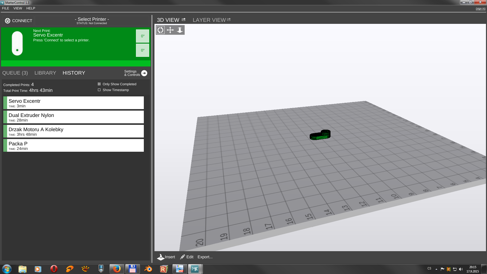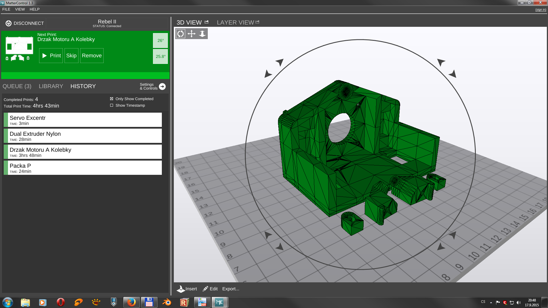 Další je HISTORY, kde se vám zobrazí už provedené tisky s časem, jak dlouho běžely. Jinak abych nezapomněl doba tisku je zde vypočtena o něco delší než pak ve skutečnosti je, třeba mě u jednoho ukazuje 4h 23min a samotný tisk pak trval 3h 48min (nikde jsem zatím nenašel kalibraci jako je u Repetiera)