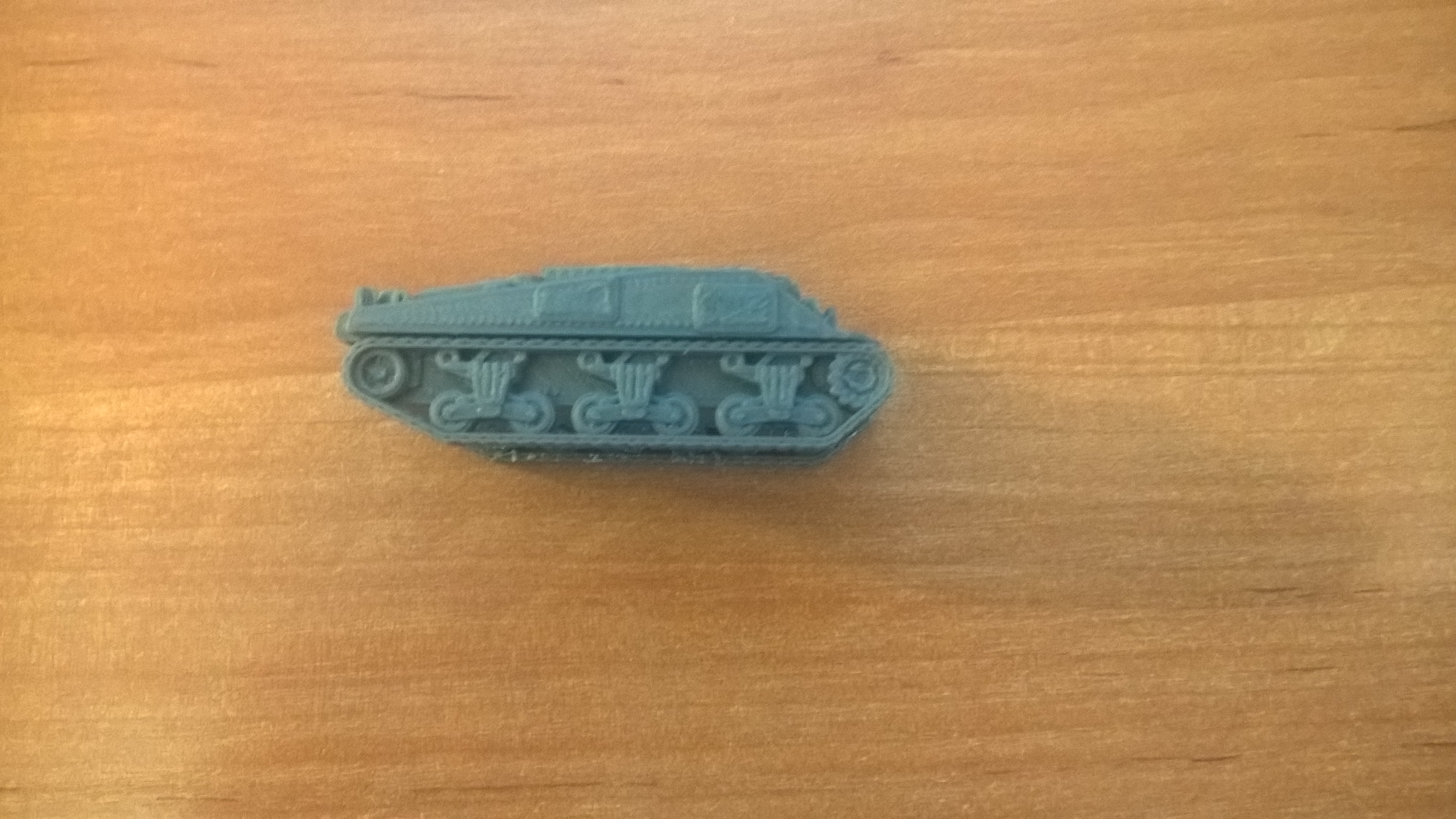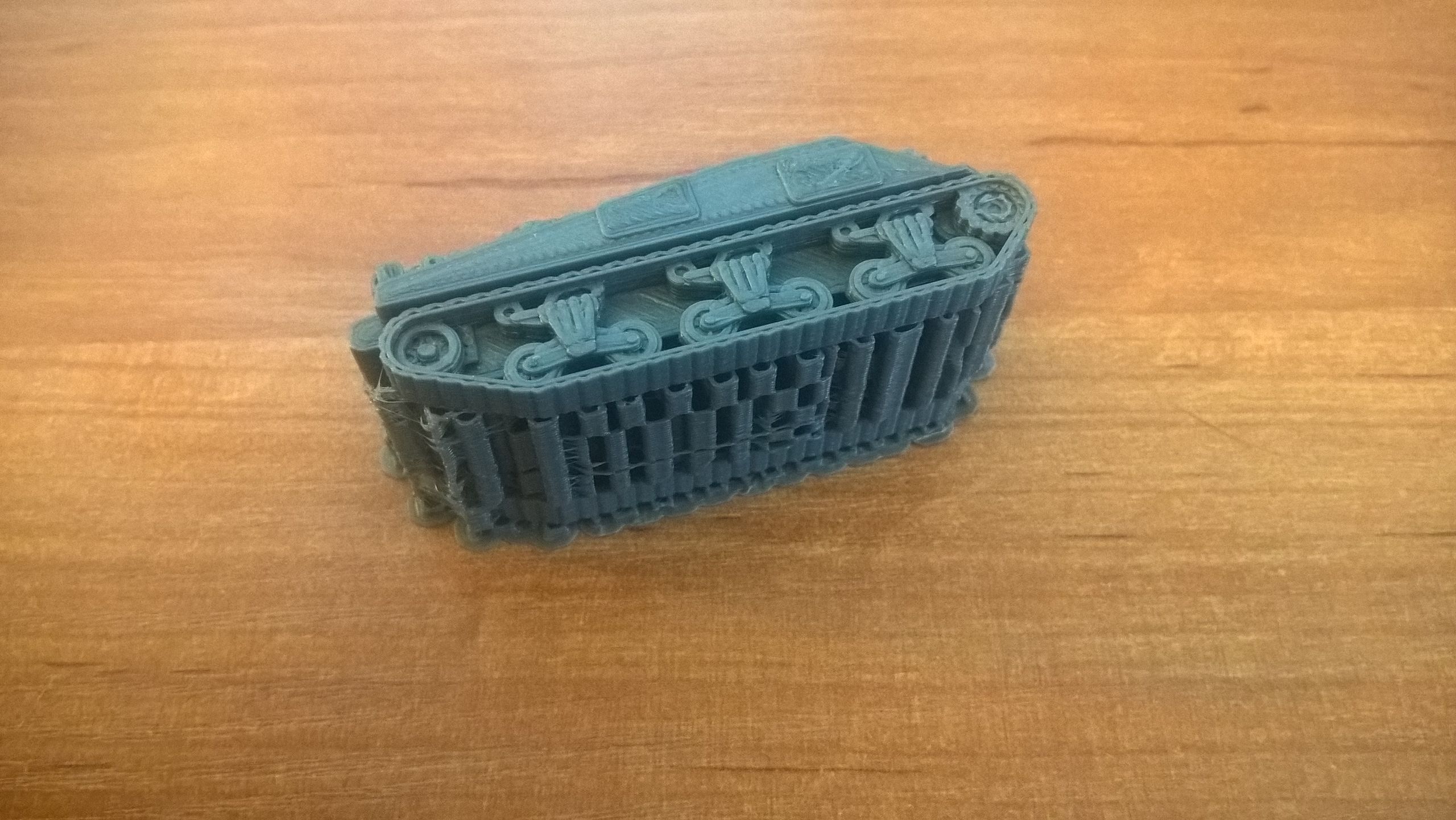 Výtisk má akorát malou chybu, kterou jsem způsobil já natočením modelu při tisku. Plochy jinak vypadají velmi dobře i ty detaily, takže jsem s tím spokojen. Jsou čisté a bez bublinek a přečnělků jak tomu bylo Slic3ru při stejné rychlosti tisku. Rychlost tisku byla 30mm/s vnější perimetr, ostatní 60mm/s, přejezdy 100mm/s. Výška vrstvy 0,2 mm a tryska 0,4 mm. Teplota bedu 105°C a hotendu 235°C. Velikost tisku je 6×2,7×2 cm