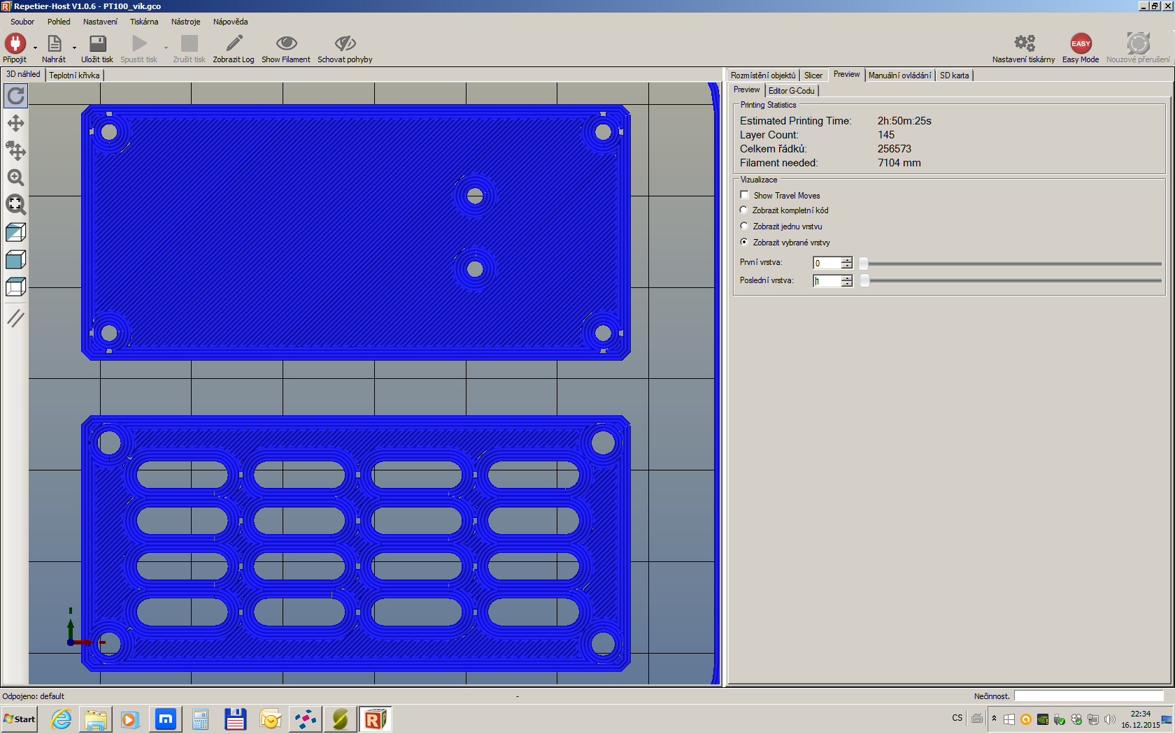 Díky moc za zkoušku. Předpokládám podle G-code, že jsi tiskl 0,5 mm tryskou a vrstvou 0,25 mm.