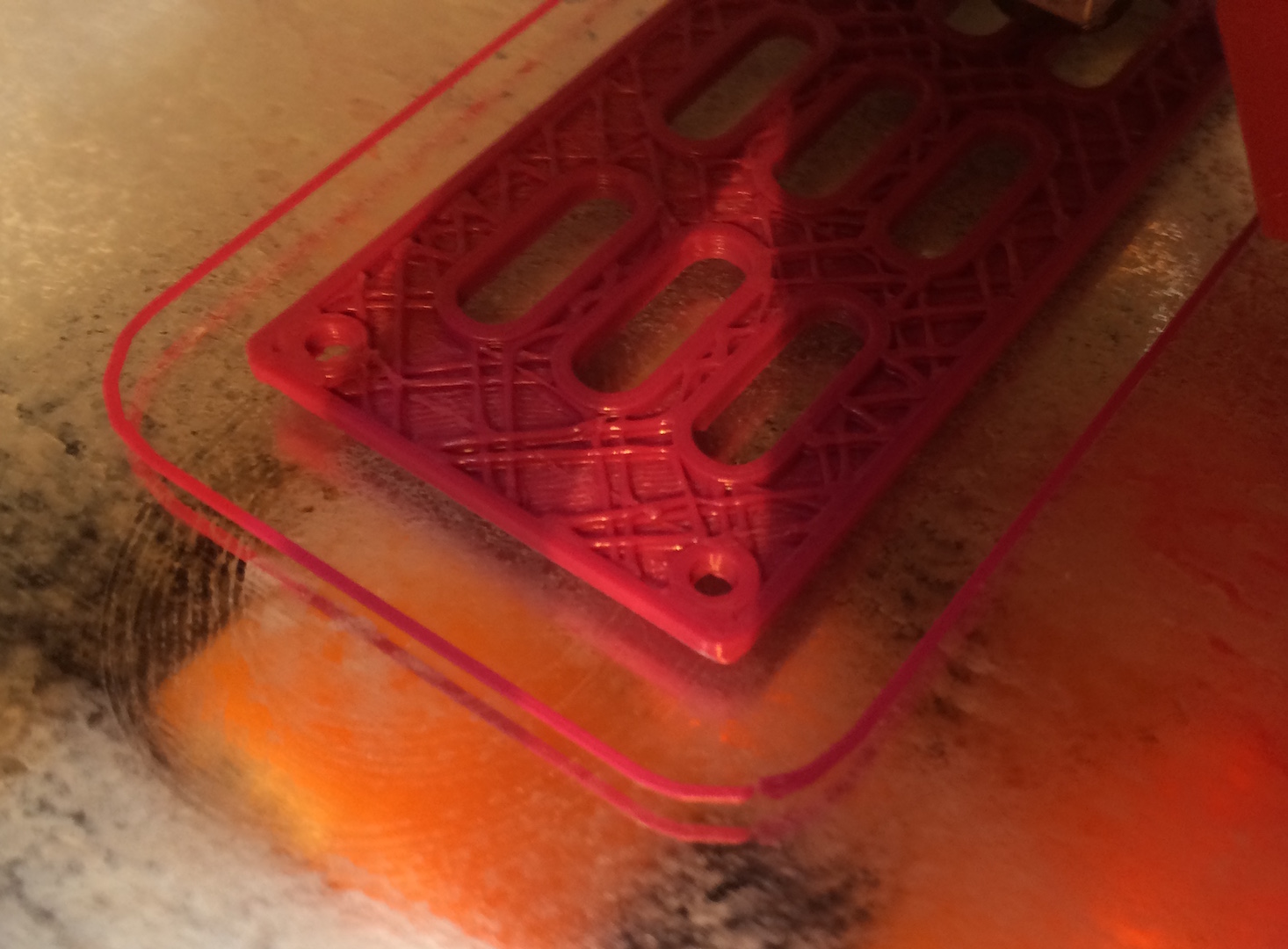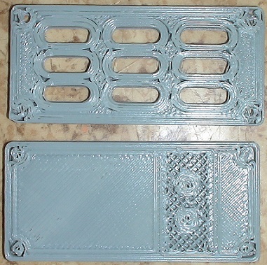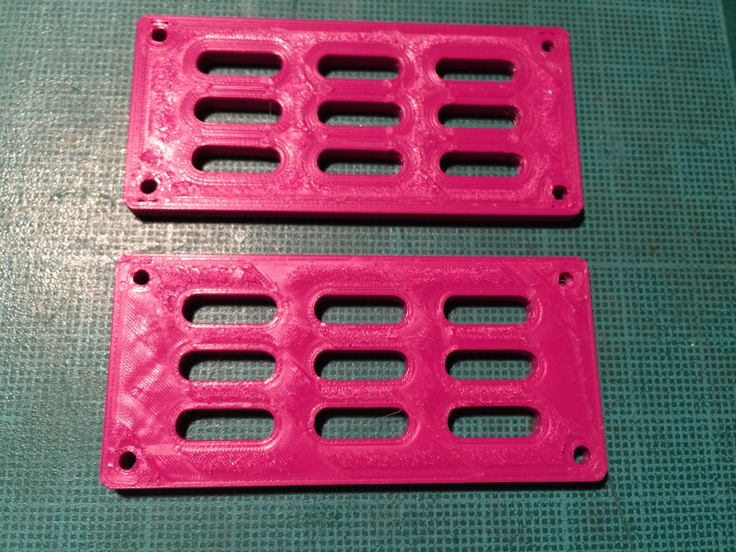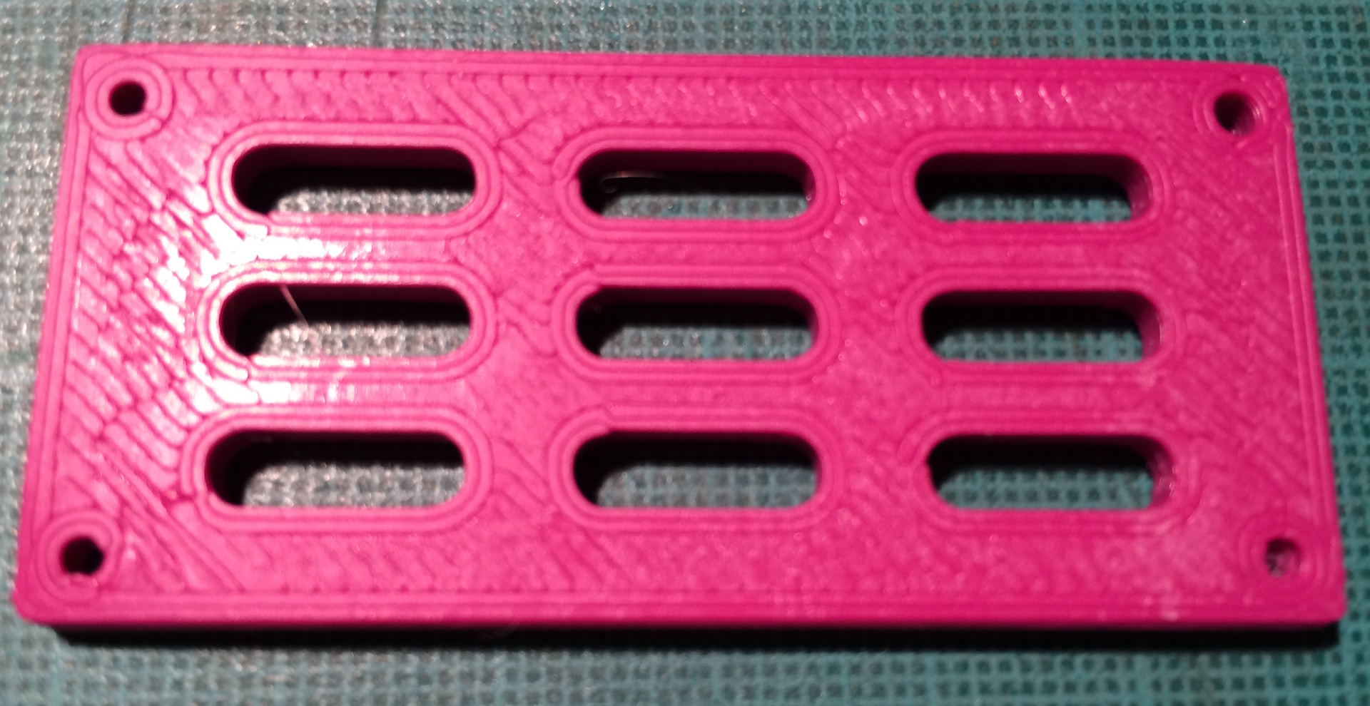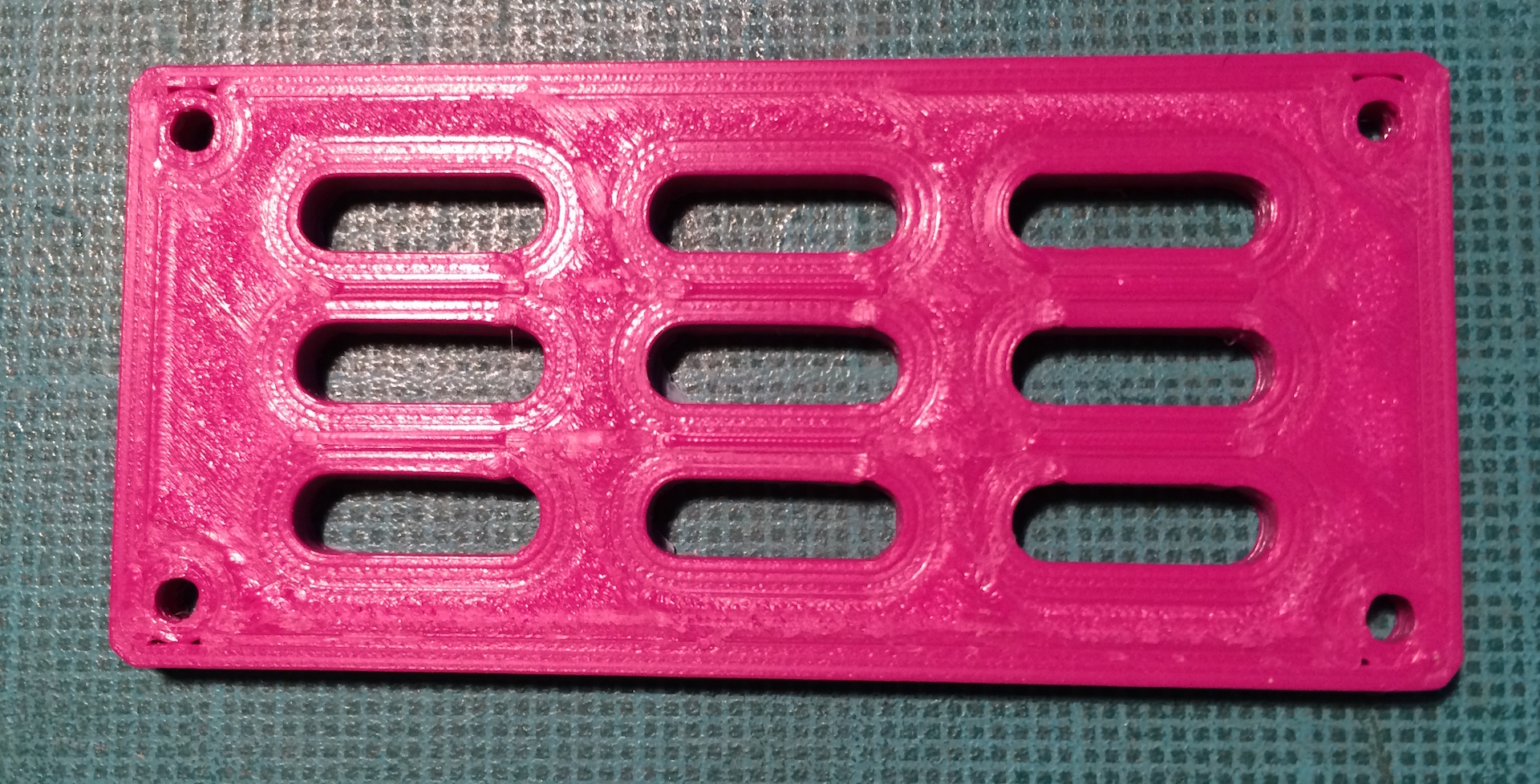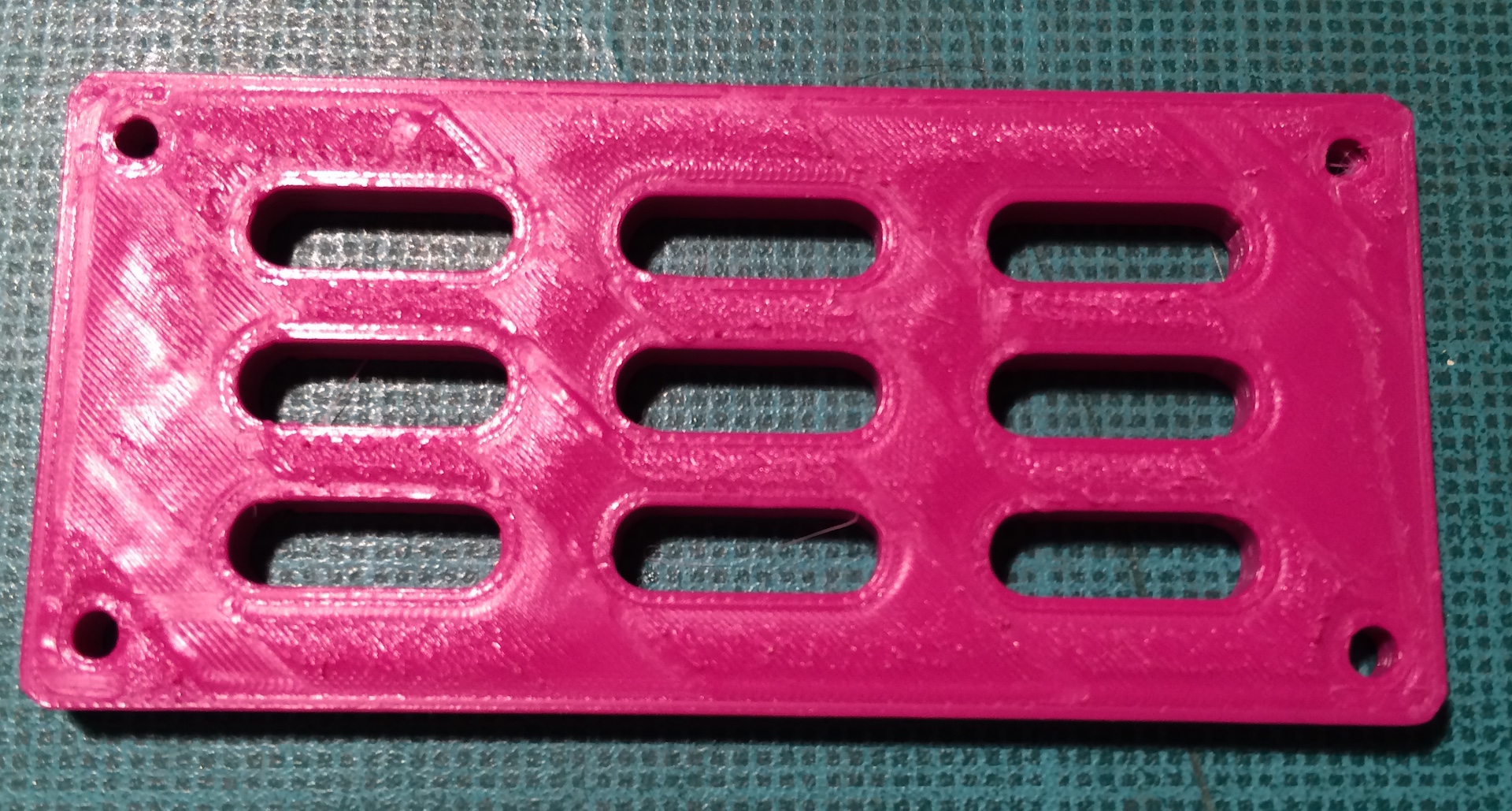edit: Mě z toho snad klepne! Protože při tisku vznikla nepoužitelnost hlavně kolem chladících oválů, upravil jsem počet oválů a tady je výsledek. Nepovedený díry v rozích a ty ovály je top perimetr. Strašný :x Vůbec netuším, co se děje. Díry mají průměr 2 mm, ovály 12x4 a celý 60x25mm.