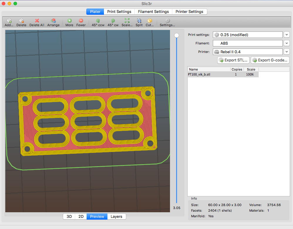 Ne je to slicovaný a tisknutý tryskou 0.4 mm vrstvou 0.25mm