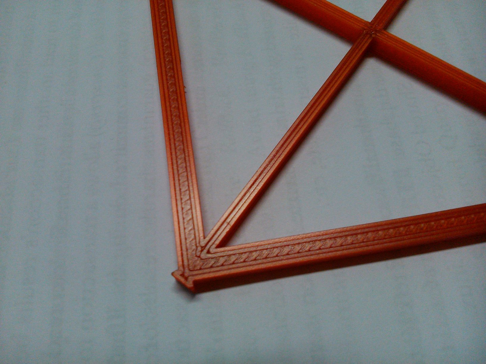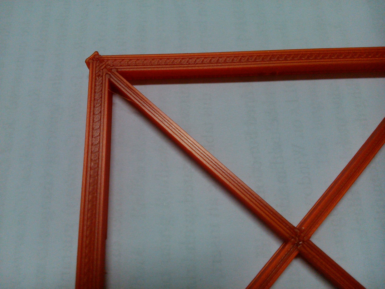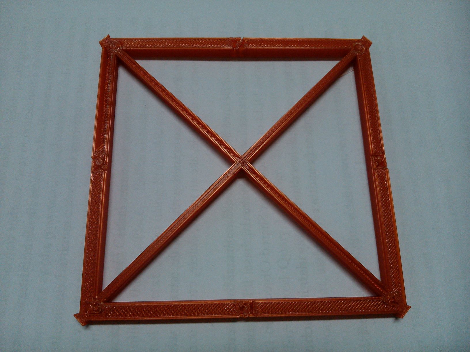 Uvedeným nastavením jsem vytisk test kolmosti tisku X-Y (rovina bedu). Na obrázcích je to čtverec s úhlopříčkami. Tisk mi (až na zjevné vady) od pohledu přišel celkem dobrý. Vady jsou: