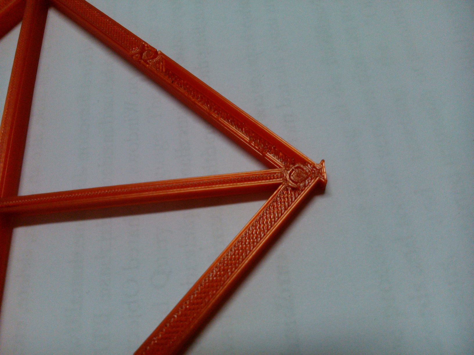 Potom jsem zkoušel tisk mostů (dorazil větrák na chlazení výtisku), který byl mým prvním takovým testem. Původně byl ofuk nastavený na 30 % jenom při mostech, ale při tisku testu na mosty jsem zaregistroval, že se mi na jedné straně zvedá zakončení tisku - tisk je hodně široké "V" a jeden okraj se krotil směrem vzhůru. Tryska do toho pak najížděla. Zkoušel jsem to nejprve přimáčknout prstek, pak mě napadlo dát ofuk na 50% a ono se to srovnalo. Zbytek tisku jsem pak ručně zapínal ofuk, pokaždé, když se sám po dokončení mostu vypnul. Zhruba od půlky výtisku jsem ofuk namísto na 50 % pouštěl na 100 %, protože se mi zdálo, že se to kroutí a 50 % je málo. Jenže v mostech jsou viditelná samostatná vlákna, vnější hrany "V" jsou divně pokroucené a zdeformované, prostě hnus... Nakonec se mi z neznámého důvodu hryznul tisk, bylo to skoro na konci, ale už jsem přetahoval, tak jsem jenom restartoval tiskárnu, abych mohl zaparkovat hlavu a šel spát - od toho je na posledním mostu takový "ďublík".
