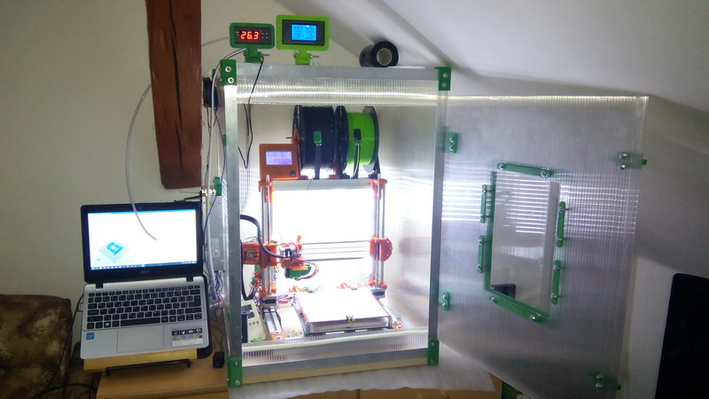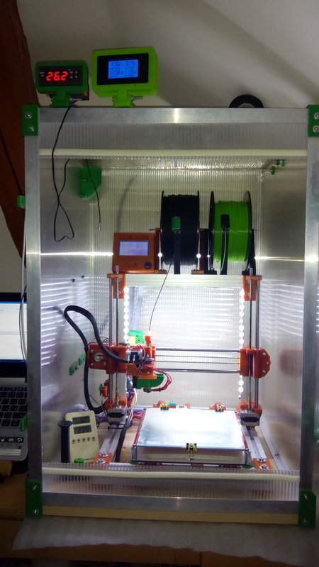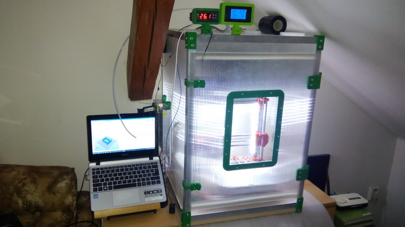 Můj temperovaný box pro REBELA. Temostat udržuje teplotu v boxu na 40stupňů a od té doby žádný prasklý výtisk. Použitý materiál Lexan 10mm a hliníkový jekl 25/25.