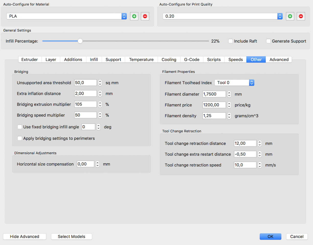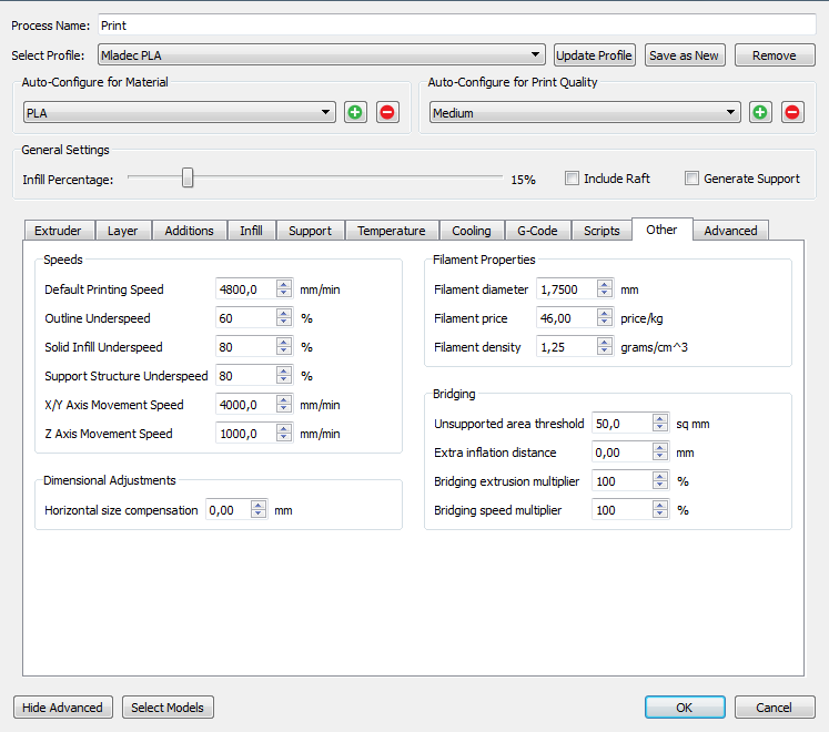 Já zatím tisknu jen s tryskou 0,4 mm a pro přesné tisky nastavuju v S3D tloušťku vrstvy 0,1mm a šířku linky 0,2mm (s PLA to funguje