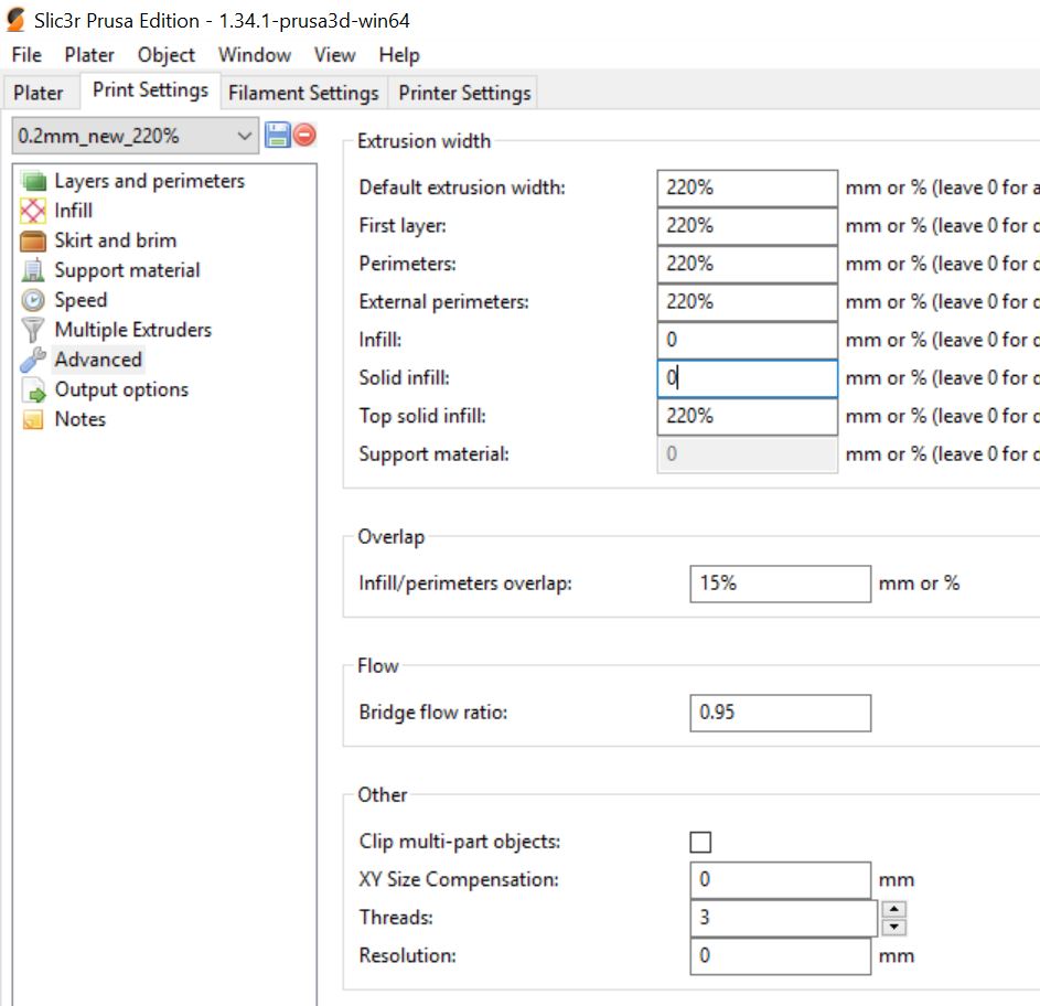220% z 0,2mm vrstvy je 0,44 širka extruze. za pokus nič nedáš. nastav výšku vrstvy 0,2 a všade daj 220%, okrem infilu