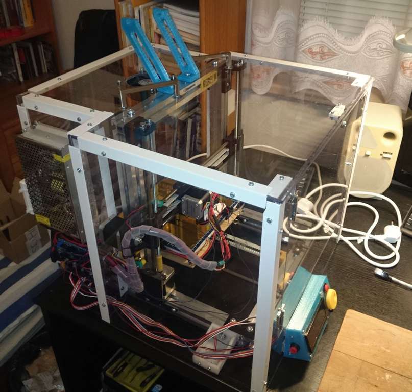 No já to přikryl nikoliv akváriem, ale plexisklovou konstrukcí, pevně spojenou s tiskárnou. Docela to funguje, na obrázku ještě chybí nějaké drobnosti. Ale ta průhledná krabice se hrozně blbě fotí... :) Je to jako akvárium...