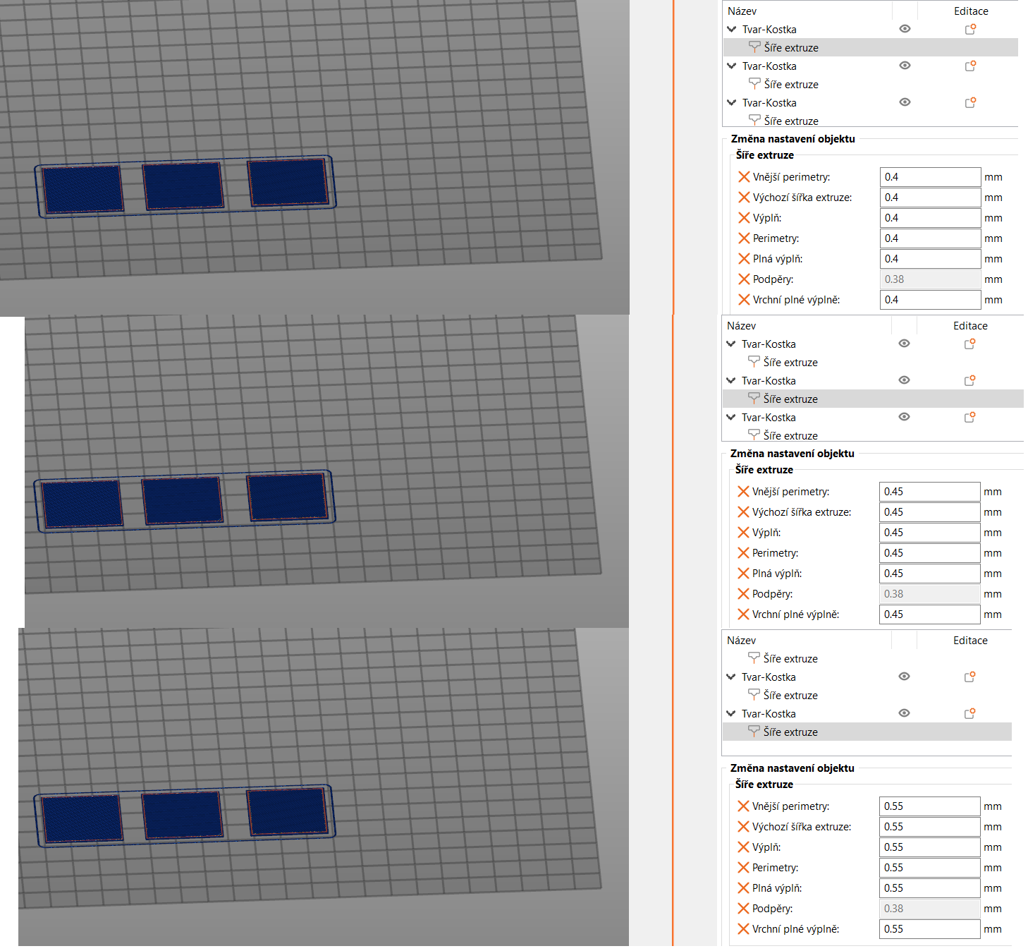 Skusim vytlacit 3 stvorce z dvoma vrstvami a kazdy ma ine nastavenie extruzie. Uvidim tie rozdiely.