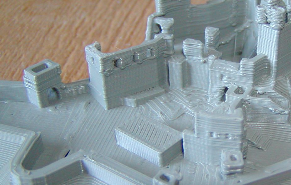 Je vidět, jak tisk probíhá v pořádku až do chvíle, kdy je retrakce častější a dojde k přidávání materiálu. Tuhle funkci jsem využíval při tisku drobných slupů. pokaždé si to přidalo tolik materiálu, že byly hutné. Zvětšením sloupů v modelu by sice byly větší, ale zase prázdné.