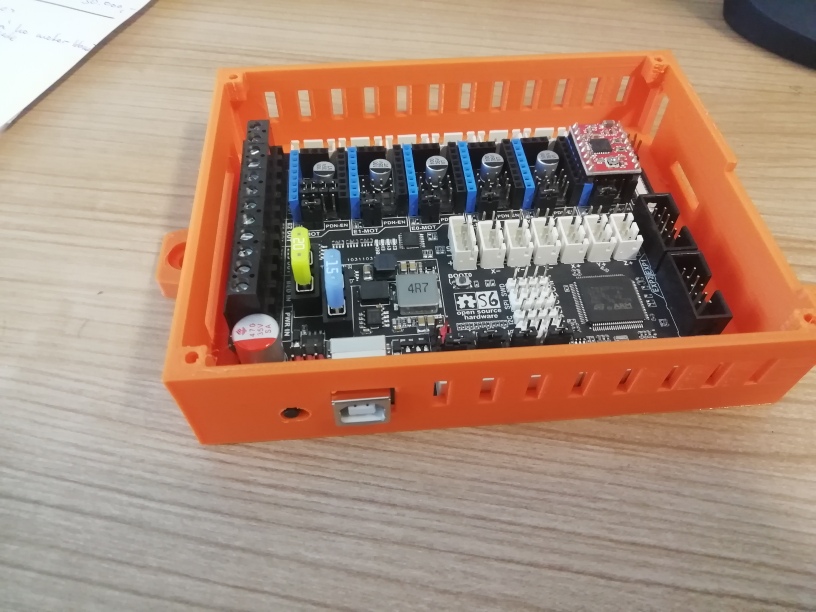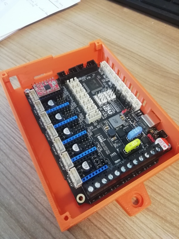 Jednoduchá krabička + víko na FYSETC_S6 (mělo by to být totožné s F6). Uchycení na levou stojku dozadu na plocho pro šrouby M6 do profilové matky. Bude nutné ještě asi udělat distanční podložku mezi krabičku a profil 30x30, motor osy x je tam dost natěsno.Víko pro šroubky M3. Deska je pro uchycení M3 do zalisované matičky zvenku (pomohl jsem si pájkou), tisknuto PETG 40%.