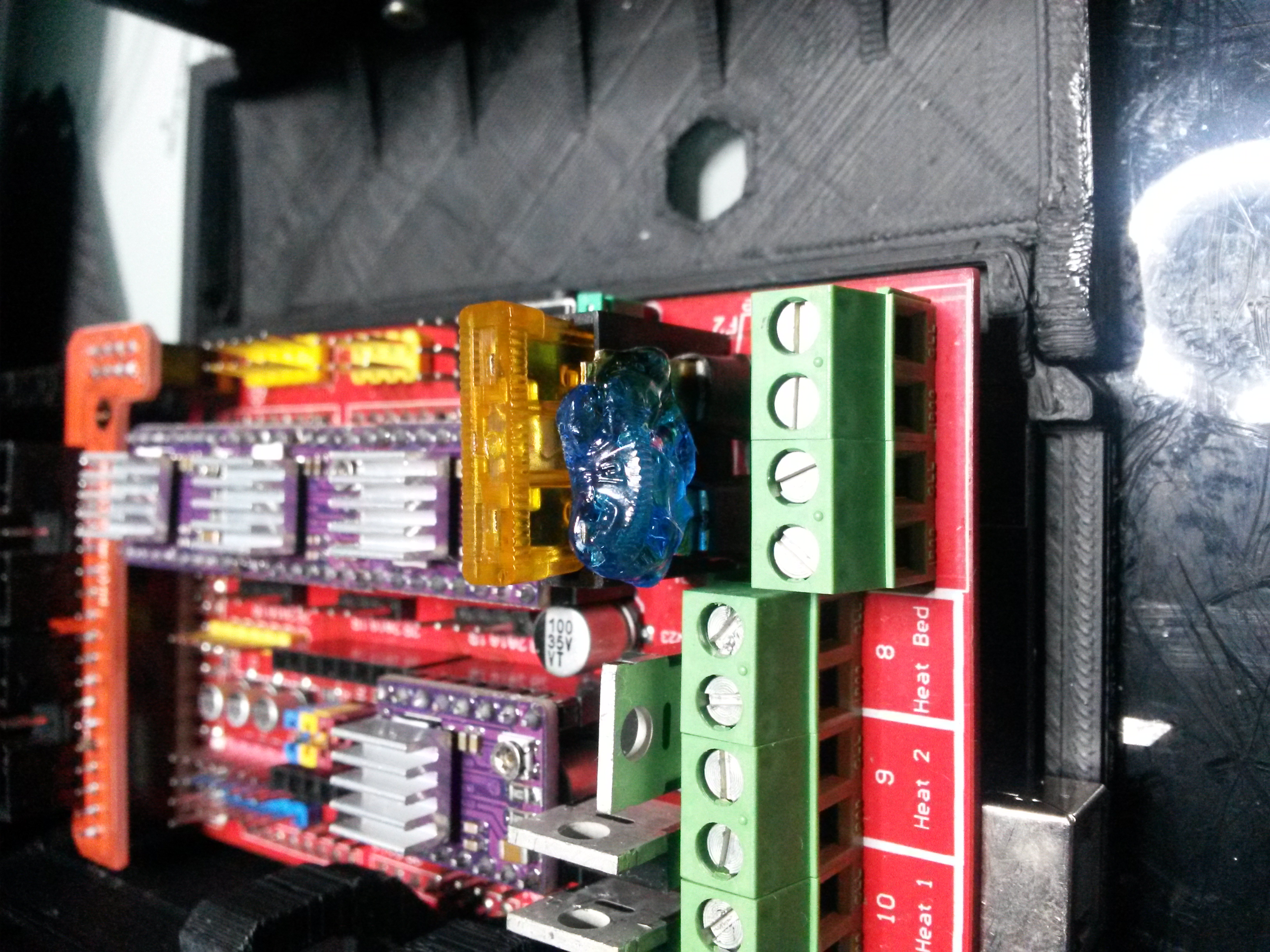 Na úvod uvádím, že jsem vyměnil vratné pojistky za autopojistky a vyměnil jsem i výstupní svorkovnice pro Hotend, ofuk a Heatbed. Vstupní svorkovnici pro zdroj jsem vyměnil až dnes po demontáži elektroniky. A protože se mi zdálo, že Heatbed topí pomalu a měl problém dosáhnout teplotu, zvýšil jsem napětí zdroje na 13.3V