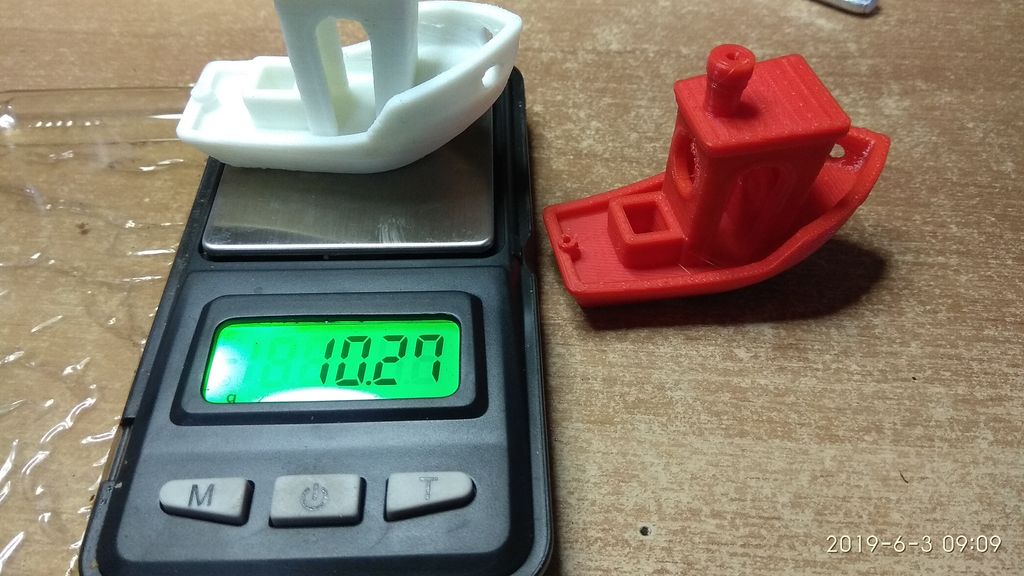 Tisk stejný, 2 perimetry, teploty 110/220 °C. Zajímavá je váha, to červené je PLA a má váhu 14.2g