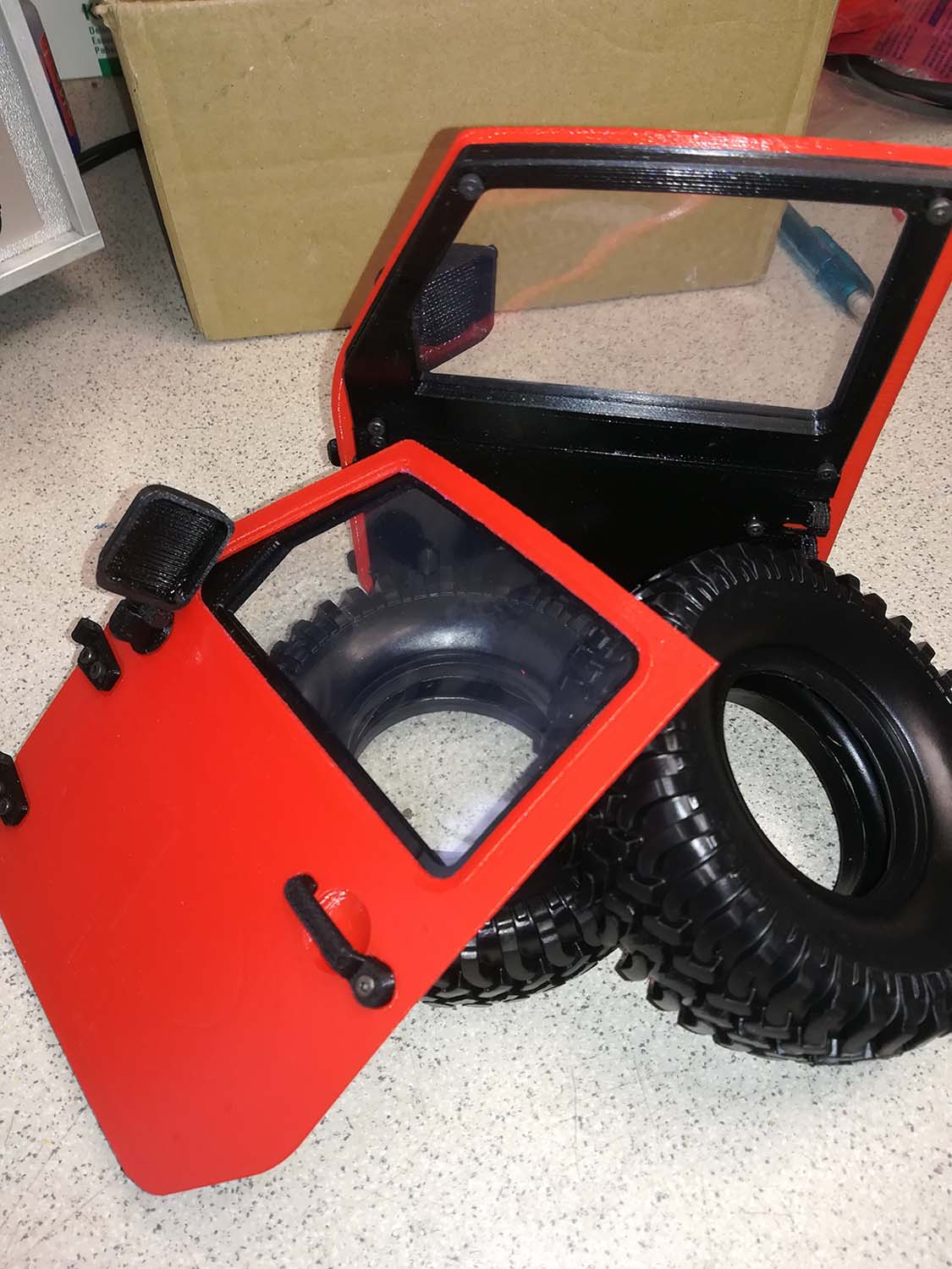 zbyly mě tady nějaké věci po stavbě Jeep Rancher 4x4 od 3Dsets.cz. Přední dveře a 4 pneumatiky 100/35 mm. Pokud by měl někdo zájem tak za cca 200.- plus poštovné se toho rád zbavím. Tisk z PLA Verbatim černá a červená. Místo Plzeň.