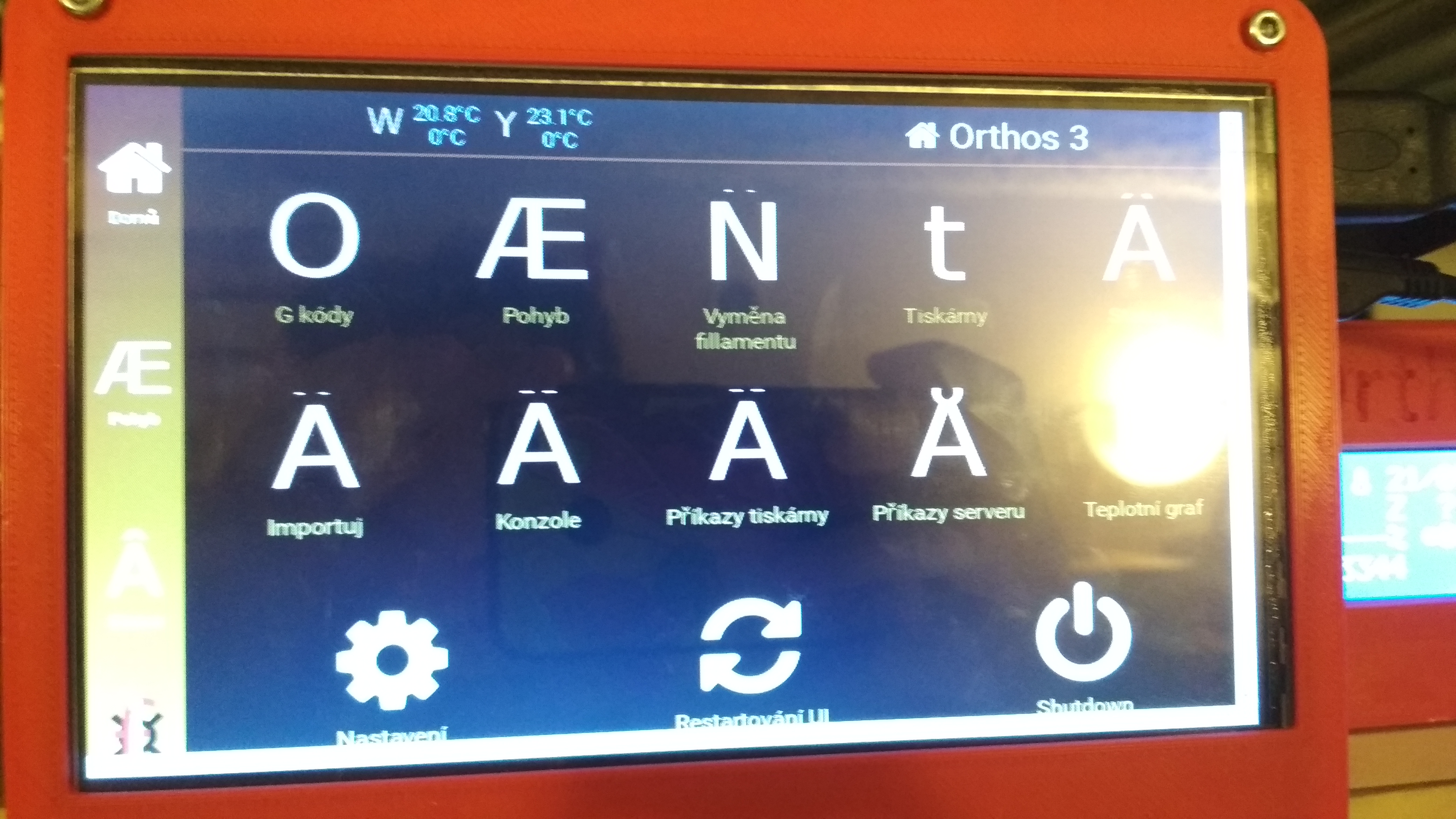 Tak jsem dneska pustil Repetier server a na displeji je naprostá většina ikon nahrazených písmeny a znaky nejrůznějšího druhu a navíc je i jejich velikost trochu špatně (dole ani vpravo nemají být posuvné lišty) v důsledku čehož je i horší detekce doteku.