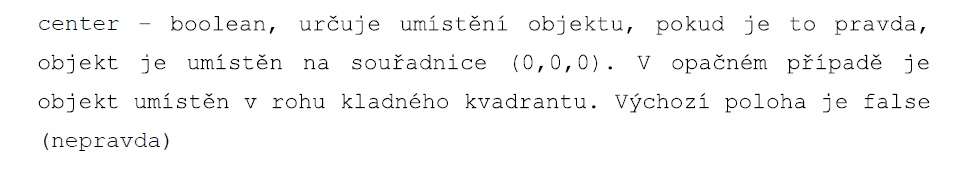 A ted jeste zpatky k tomu cylindru, v nekterych tutorialech zjednodusuji kod a misto center=true, napisi pouze true. Chapal jsem to jako zjednoduseni kodu s tim, ze se to zezacatku uvadi cele pro obraznost a pochopeni a ze zkusenejsi modelar to nemusi porad dokola opisovat.