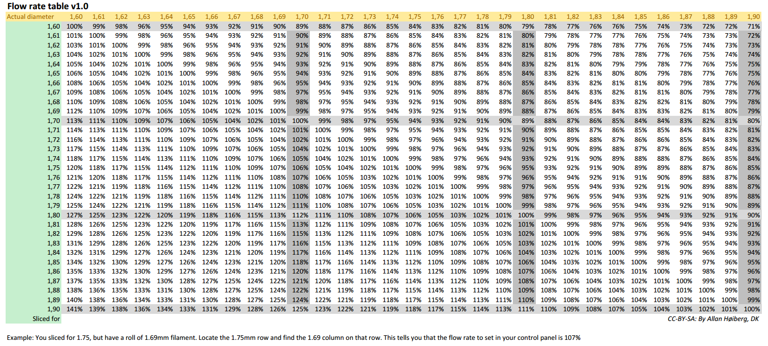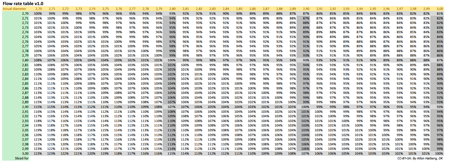 Nebo ještě jednodušeji používám u 3mm přibližně 7% na desetinu rozdílu. U 1,75mm je to větší rozdíl ale i tam mi většinou stači na desetině dát "baj voko" 12%.