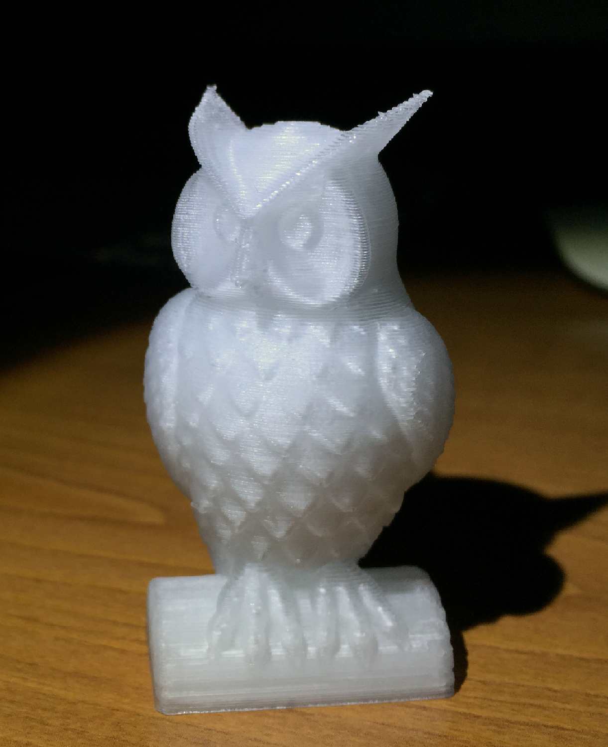 musel som tlacit na buildtak, lebo nemam ine sklo teraz, sova sla dole lahko hned po tlaci, teda na buildtaku to moc dobre nedrzi, skusim kupit sklo a tlacit nanho. Zaijimave je, ze chlpy medzi usami nie su, retrakcie mam 1.5mm a 1800mm/s a nastavene na furt
