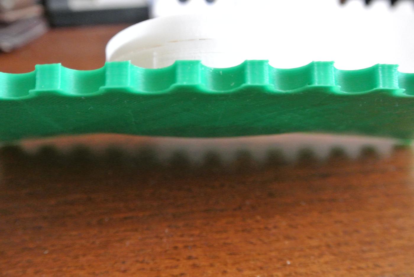 Na tom snímku zespodu je vidět "boule" jak to zdeformovalo ABS pod tělesem výtisku na té objimce z boku je to vidět hůř ale asi uprostřed jsou tenké podélné praskliny mezi vrstvami. mavá barva/fleky je kolize s hlavou jak se to ohýbalo...