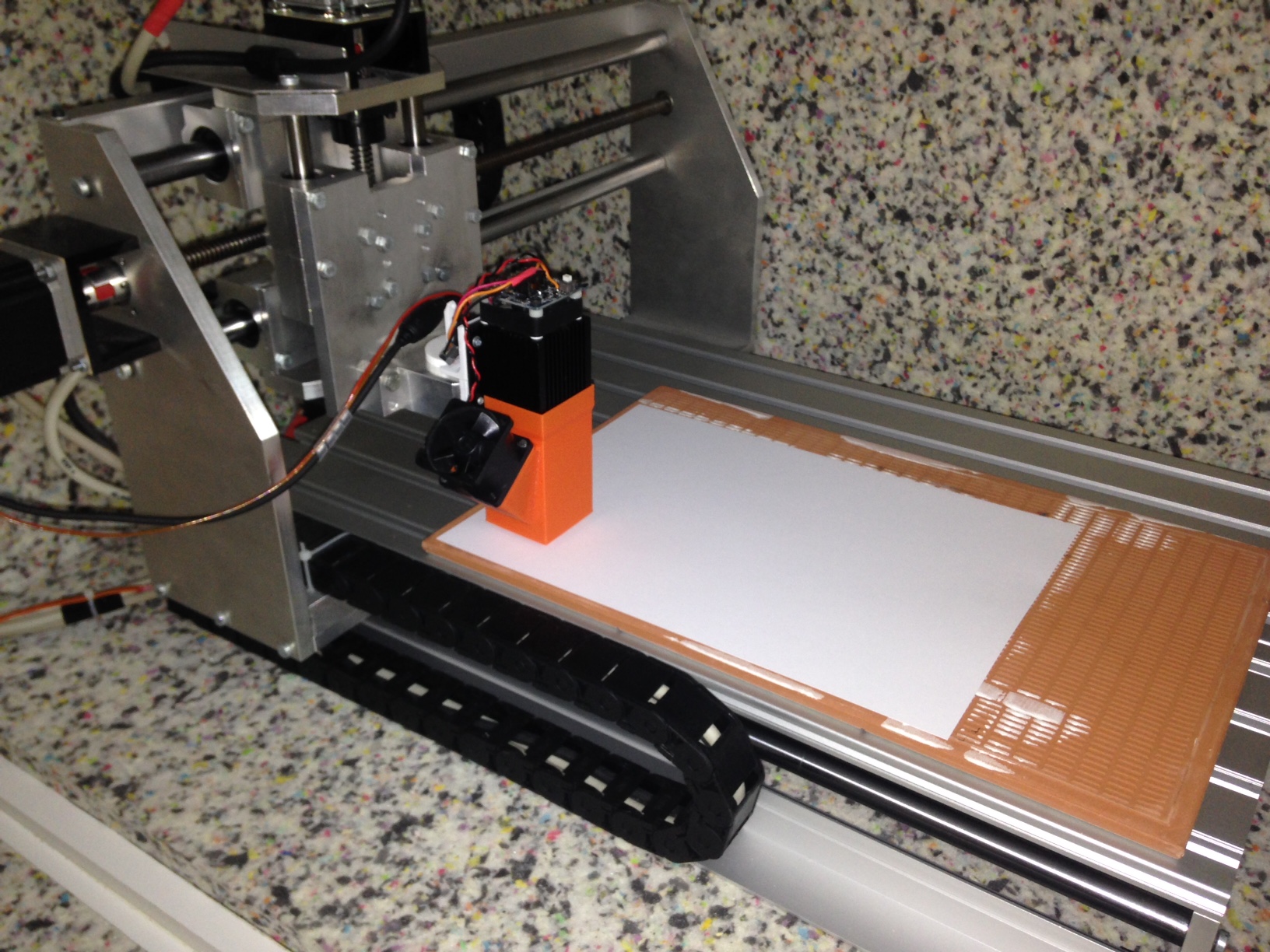 Vytiskl jsem si nástavec z PETG (neprůhledný!), který má dole vzdálenost od papíru 5 mm (tam je paprsek zaostřený nejvíce). Zároveň je na něm uchycený větrák a směruje ofuk na řezané místo. I s tímto krytem je ale vhodné použít brýle, nicméně odražení paprsku a přímý pohled na něj je již vyloučen, mám to zakryté v bedně. Funguje to perfektně.