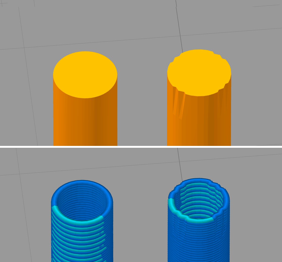 Příklad na následujícím obrázku - váleček o průměru 2mm, vlevo nezměněný, vpravo použita funkce Mesh reduction s hodnotou 0,2mm.