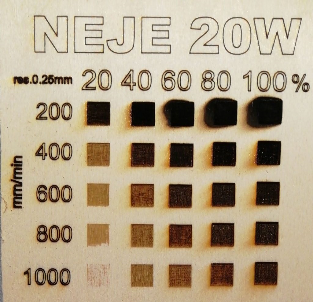 jako schopné pro gravírování se zdá rychlost 1000mm/min a výkon 60 až 90%. Pokud mi to běží na 100% má to odběr 1.85A včetně větrákupři 12,5V. Pro jemné 1bit obrázku bude vhodné zpomalit na cca 500 s výkonem někde kolem 50%. Na řezání 3mm topolové/březové překližky se mi osvědčila rychlost 320mm/min 100% výkon a 3 průchody po 1mm s tím, že je lepší mít pod materiálem mezeru, podkládám to. Vše co je vyloženě černé je už uhlí, 200mm/min a 100% jde do hloubky asi 1mm při rozlišení 0.25mm/čáru.