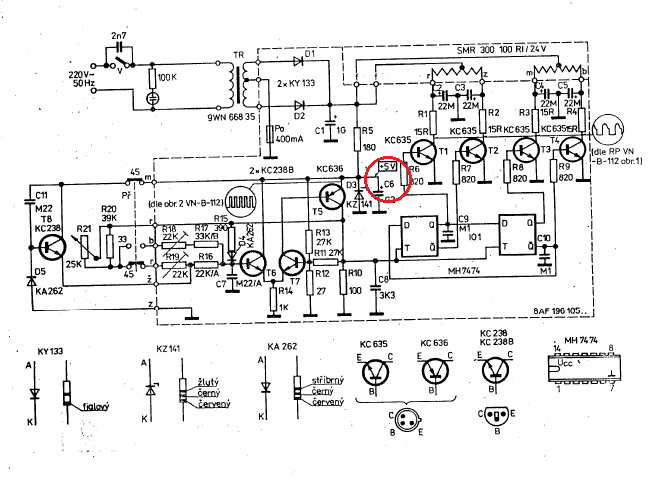 Ten odpor je určitě na 1W, ten neodešel. Zenerku tu někde vyhrabu, měl bych jich pár mít v šuplíku. Pravděpodobně najdu i tu D3.Kondenzátory jdou nahradit moderními, odpory tu najdu, ale ty neodešly. Tranzistory mám jen plastové náhrady, jestli to s nima pojede - netuším. Čím si nejsem jistej, jestli tu mám nějaký teslácký integráče, konkrétně klopáky, s těma jsem nikdy nic nestavěl. MHB 7474 tu asi mít nebudu. To bude oříšek. To nenahradím.