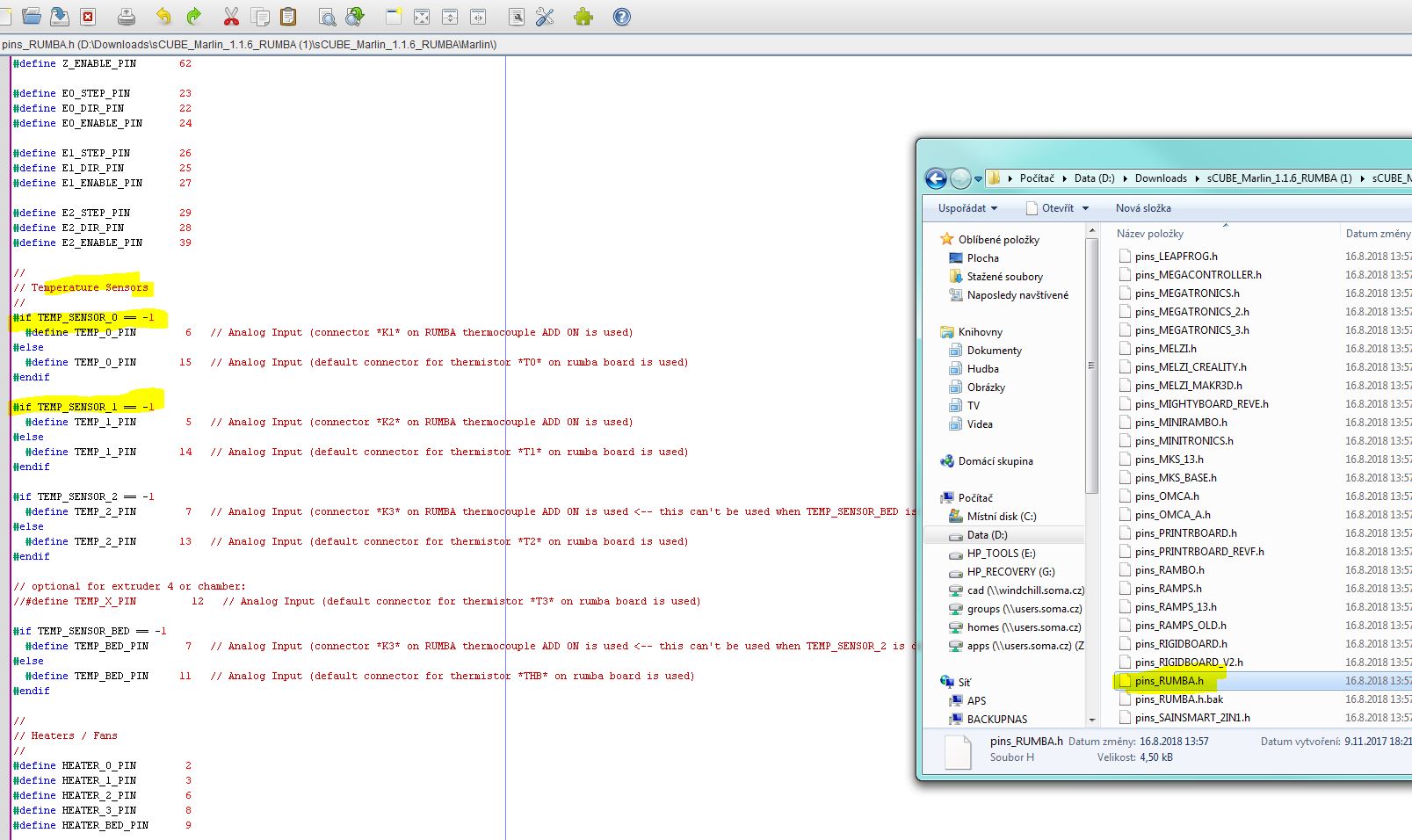 uprav si soubor pins_Rumba.h přepiš piny mezi Temp_0 a Temp_1