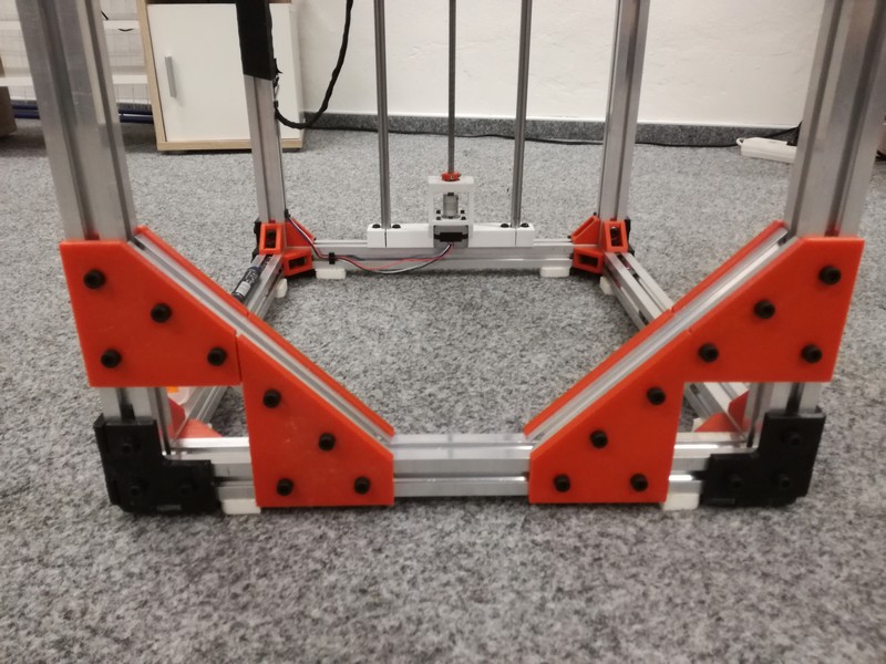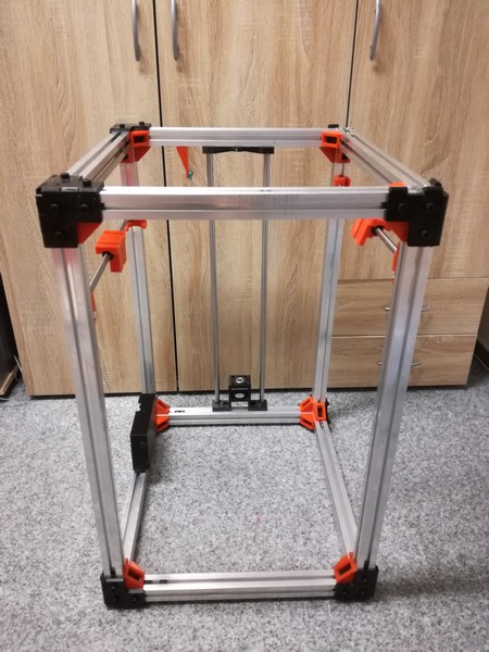 Postupně se už hromadilo spousta dílů a muselo se začít skládat. Osu X a Y jsem nechal na 10mm tyčích, osa Z je z 12mm tyčí a proto se osa Z musela upravit. Celkem trochu, ale později při stálých vibracích stolu muselo přijít další zpevnění.