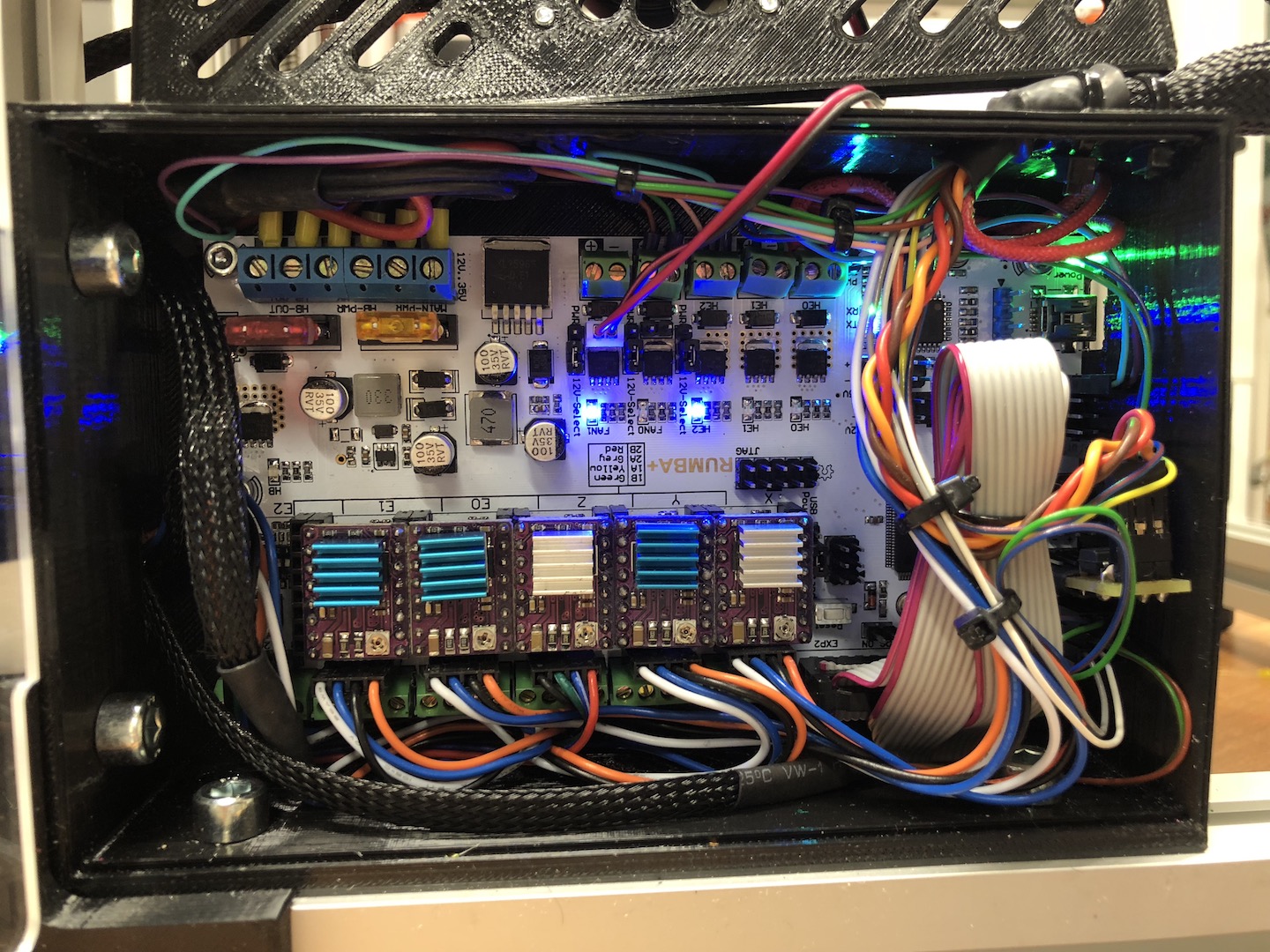 Mám zakrytovanou Kostku, zvýšenou na 550mm aby se mi tam výhledově vešla trubka s pevným extruderem. Elektroniku i se zdrojem mám zvenku. Při tisku z ABS je vevnitř pod stropem 42 stupňů a dole asi 32. Motorům to neva...Zakrytováno plexisklem 4mm... Zatím nejdelší tisk asi pět hodin - teplota vyleze na těch 42 a pak drží... Krabice je bez jakéhokoliv chlazení...