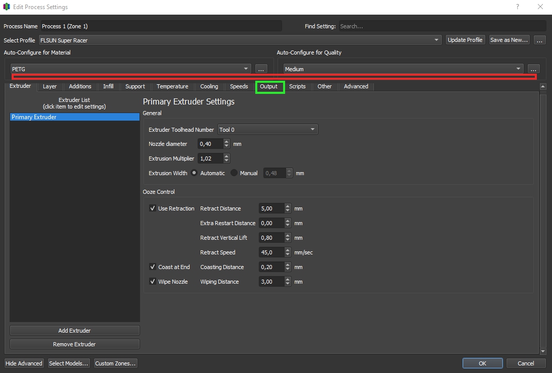 Záložka G-code se přejmenovala na Output