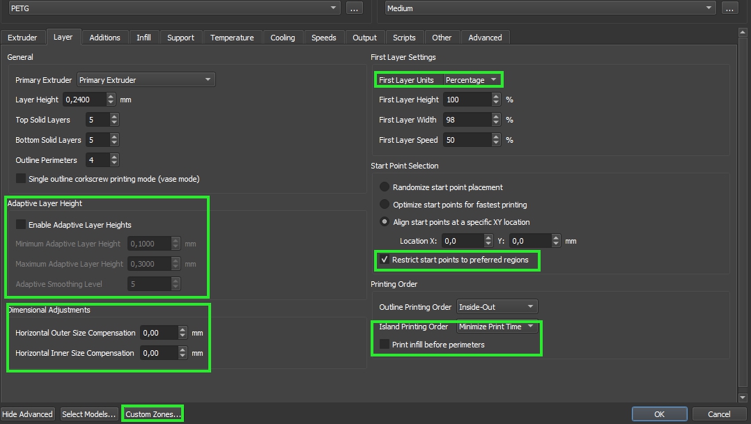 Ovládání rychlosti vnitřních perimetrů a vrchu/spodku podpěr taky potěší.