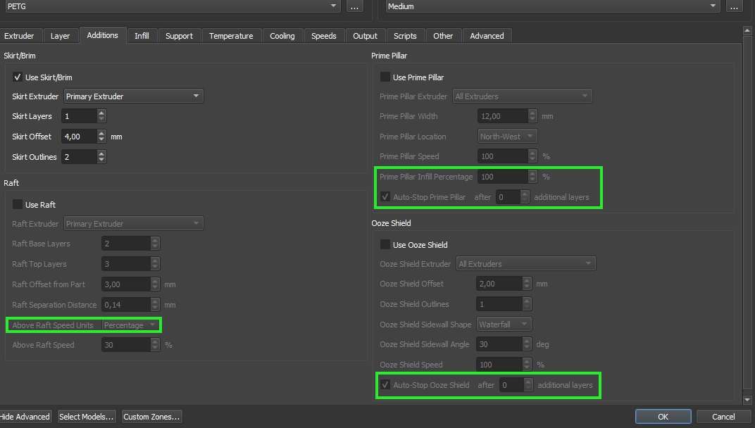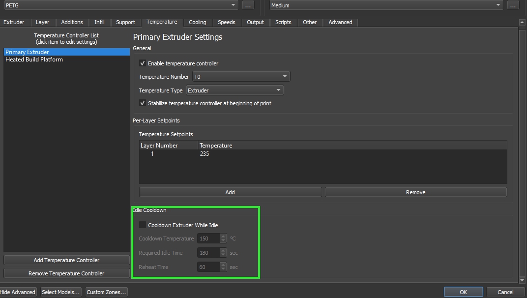 U chlazení přibylo číslování ventilátorů. V Gcode je definováno parametrem P. Pokud toto firmware tiskárny neumí , je třeba do záložky Scripts>Postprocesing vepsat: {REPLACE " P0\n" "\n"}