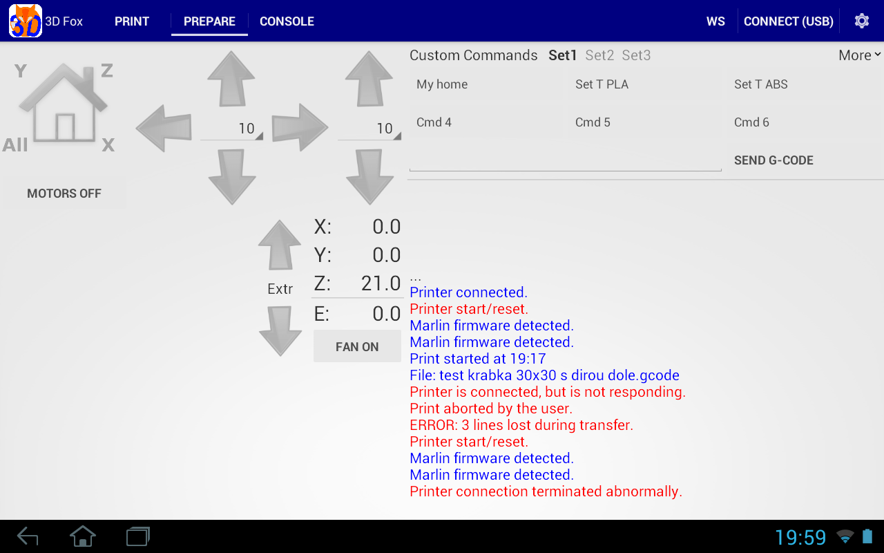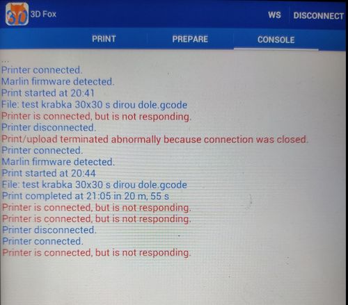 ... co se asi stane když dám aplikaci na pozadi nebo se zamkne displej říkám si... 8) no co asi... tisk se chvíli po uzamčení androidu zastaví a je konec. bed a tryska ale topí dál zapíchlá v materiálu. A co hůr nespojí se to ani po zapnutí aplikace na popředí.. opět problém s rozpoznáním zařízení na usb. Reboot tiskárny a tabletu a už to zase šlo.