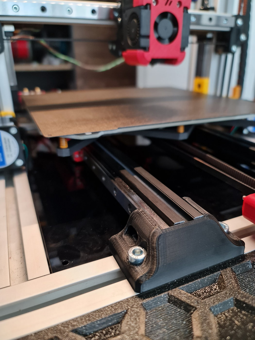 Bed jsem pridelal na lineary neb me opet dost tocilo, ze se mi nedari najit dobra kluzna loziska a zaroven dostatecne dobre vyladit vsechny ty tahove sily ktere vzniknou dotazenim vsech komponent bedu dohromady a zpusobi, ze bed bud jezdi hladce nebo mizerne... nebylo to zle... 100mm/s rychlosti to zvladalo, ale lineary jsou uplne jina liga :-)