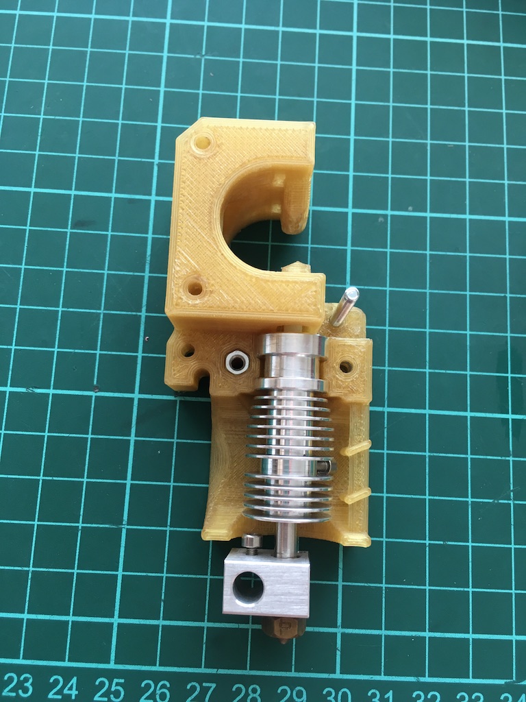 To co jsi vyfotil je nicméně špatně v obou případech... Ani jeden hot-end na fotkách tam nepasuje tak jak má. nejspodnější část chladiče má po svém obvodu doléhat na plast extruderu. Jedině tak půjde vzduch skrz žebra a na druhé straně ven a ne přímo na kostku jako v případě toho bastlu co jsi sem pastnul. Tiskárnu mám překreslenou a předělanou před sebou na stole a dost jsem si s tím především oblasti kolem extruderu užil, takže vím úplně přesně jaké má nedostatky původní návrh a kolik se toho nepovedlo od Průši správně okopírovat. Zveřejním to až budu chtít. Kdo má zájem tak PM.