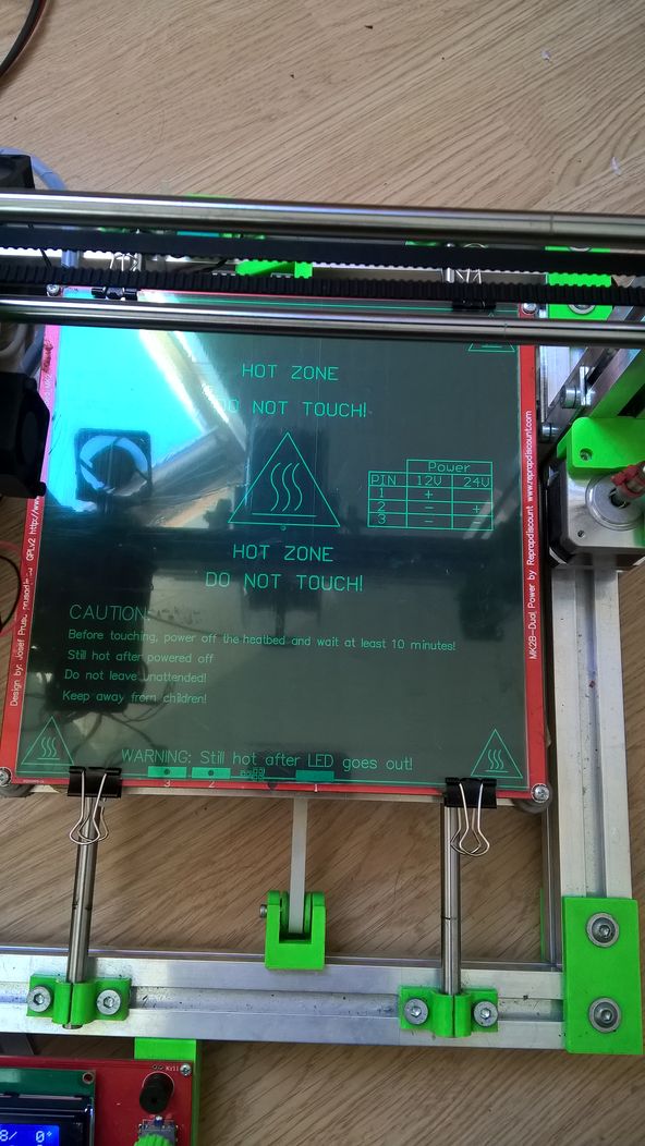 ) a začal tisknout. Chtěl jsem zjistit minimum, kdy ABS bude držet. Takže při 80°C nedrží, tak jsem teplotu zvýšil na 95°C a to už drželo o hodně lépe než Herkules s ABS juicem (pouze se odchlípli růžky a zvedli o 0,2 mm). Při tisku jsem měl 3mm brim kolem výtisku, který se neodlepil a držel odchlípnuté rohy. Podle mého při 105°C to už bude držet úplně. Jinak pro odlepení výtisku stačilo snížit teplotu na 80°C, podebrat nožem brim kolem výtisku a pak zajet nožem pod výtisk a bylo odlepeno. Možná kdybych nechal sklo vychladnout, tak by se to uvolnilo samo. Budu to dále testovat, PLA nemám abych ho vyzkoušel, jestli taky bude držet. By mě zajímalo, jak by na tom drželo PETG, které taky nemám.