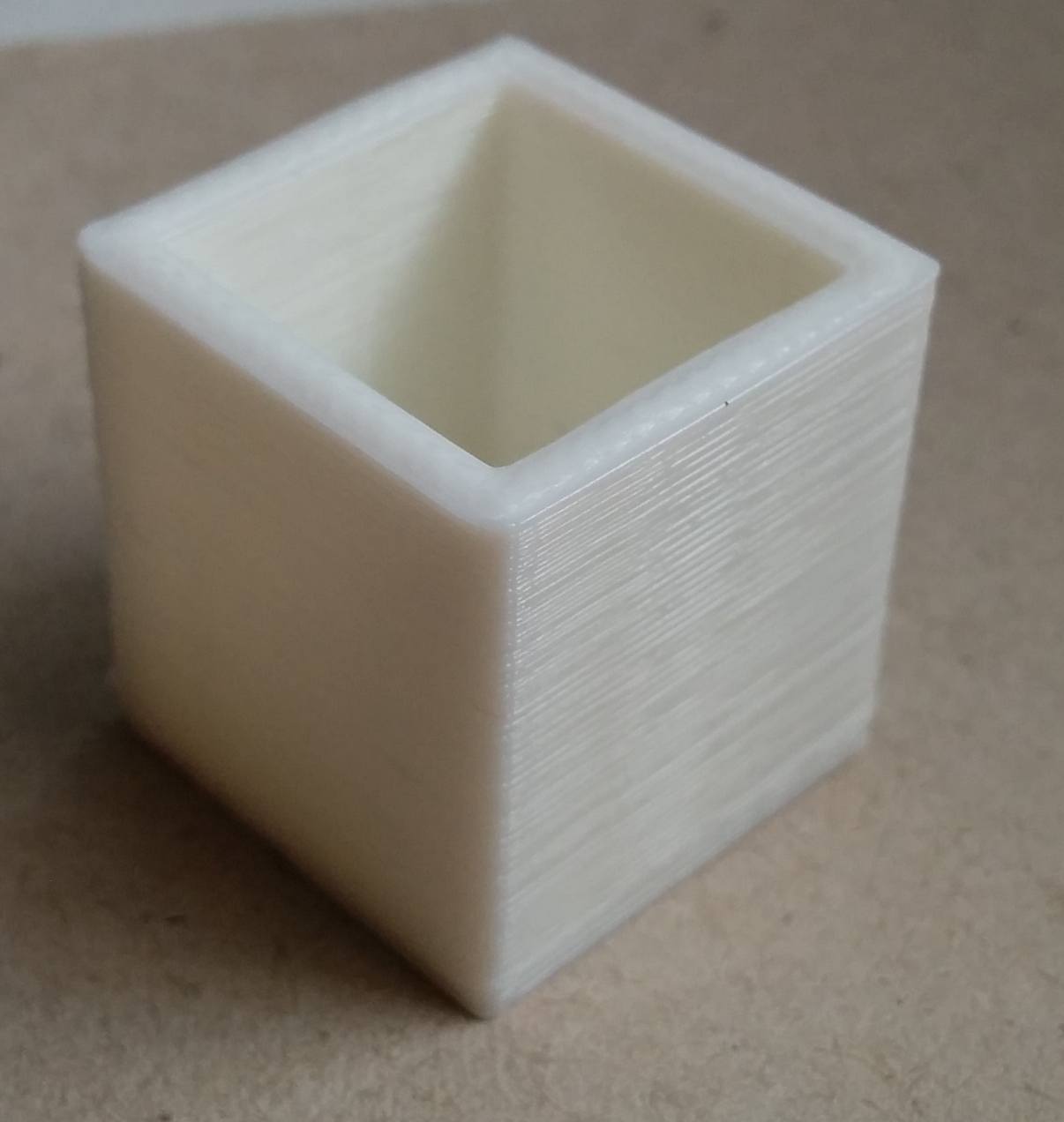 Fotil jsme to mobilem, ty kostky jsem tisk 120mm/sec a nestihlo to chladnout. Ale zajimala mne stena, ne rohy. Vrstva 0.2mm, aby byla v rezonanci se stoupanim 1mm/ot.
