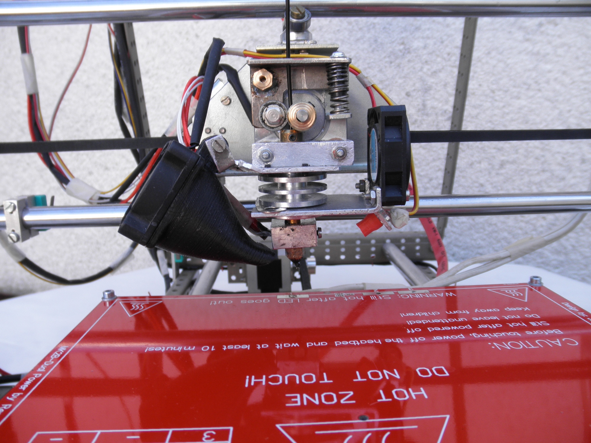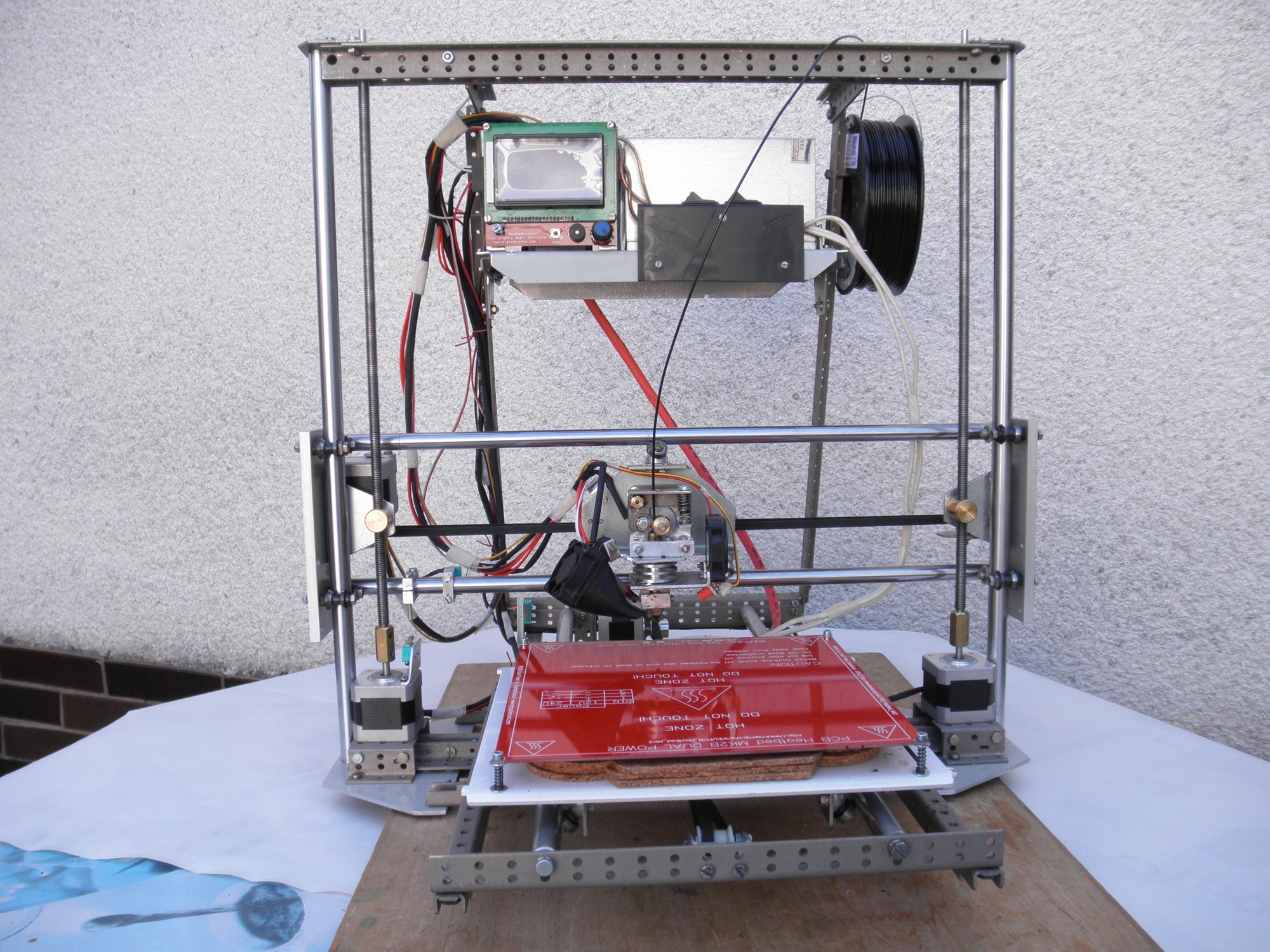 Pro napájení tiskárny jsem použil vyřazený PC zdroj MXR-250P s výstupem 12V – 10A, což na napájení celé tiskárny nestačí. Lákalo mě využití jeho výstupu 5V – 15A pro vytápění podložky. Ve svých sbírkách jsem vyhrabal PS desku, na které jsou na obou stranách proužky mědi asi 3mm široké. Při sériovém propojení proužků je odpor kolem 1 Ohmu, takže každá strana topí 25W. Společně s klasickou podložkou napájenou 12V, ale zapojenou jako 24V a regulovanou mě to zatím vyhovuje. Přidanou desku dosud zapínám vypínači, ale plánuji i její regulaci. Pod deskou mám ještě izolaci, tři korková prostírání na sobě. Úpravou regulace PC zdroje jsem zvedl 12V na 13V abych urychlil vytápění hotendu.