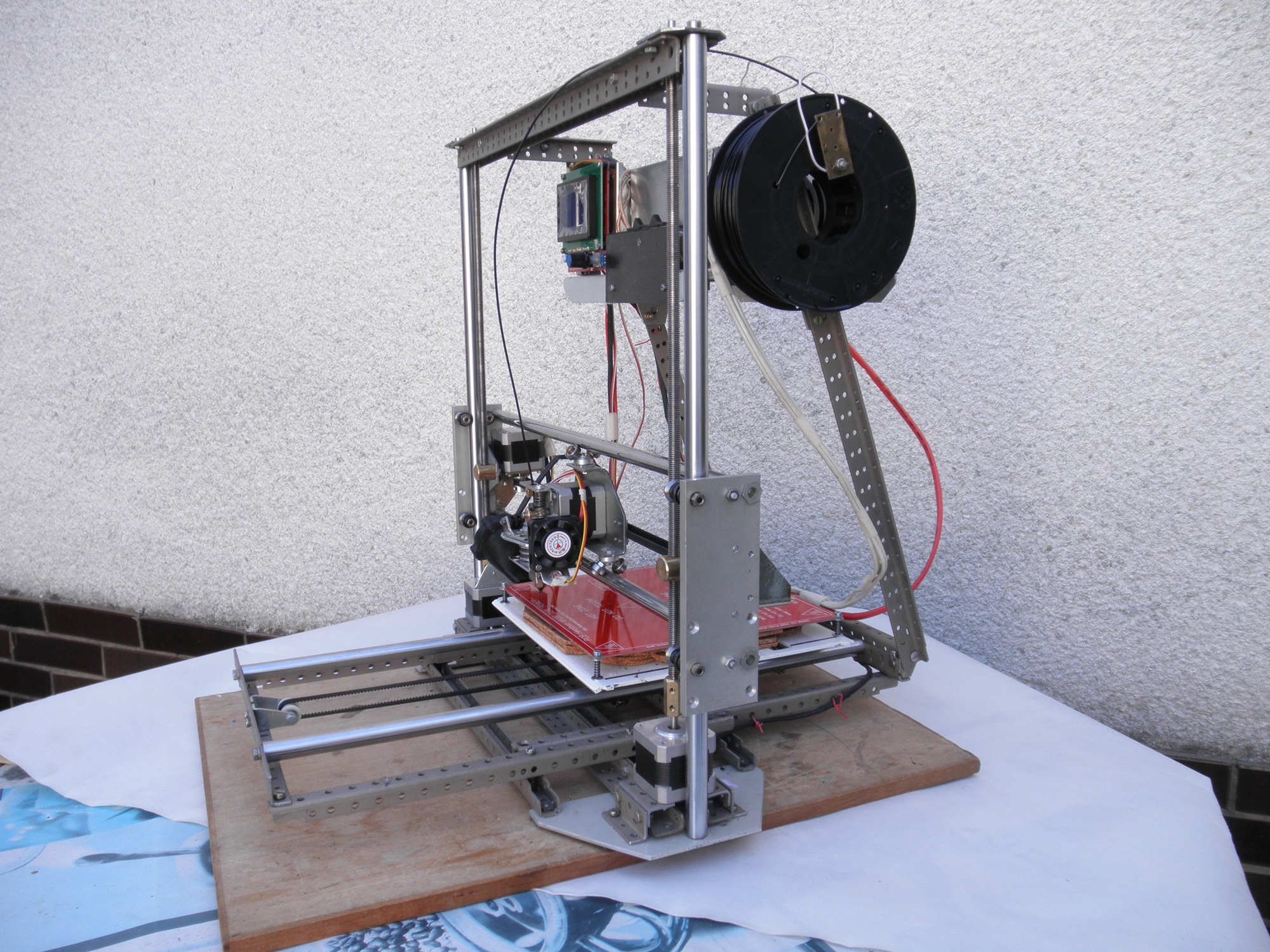 Tiskárnu jsem stavěl metodou „co dům dá“. Za léta bastlení jsem nasbíral dost materiálu, který jsem chtěl někdy využít. Zde se mi naskytla vhodná příležitost. Nosnou konstrukci tvoří profily ze stavebnice, kterou používala nějaká pražská Tesla k stavbě skříní na měřicí přístroje. Vypadají jako díly z Merkura, jsou však poněkud mohutnější a na každém je vyraženo PATENT 124337. Vodící kalené kruhové tyče pocházejí z 8 jehličkové tiskárny Zbrojovky Vyškov. Jsou sice poněkud silnější (14) a delší, ale mají na obou koncích závit. Pohyb dílů mám pomocí rolniček, část je zase z jehličkové tiskárny, další z kuličkových ložisek.