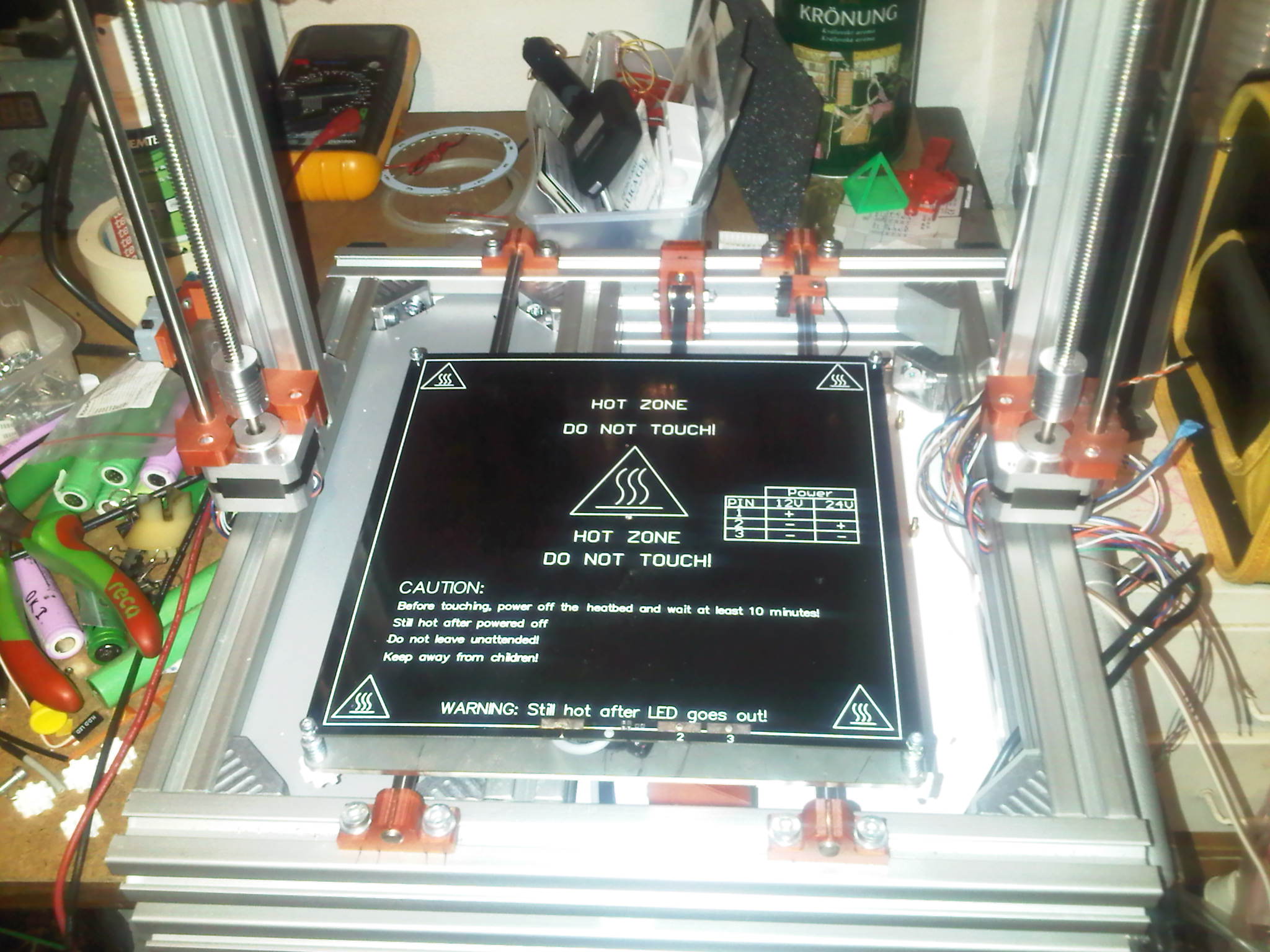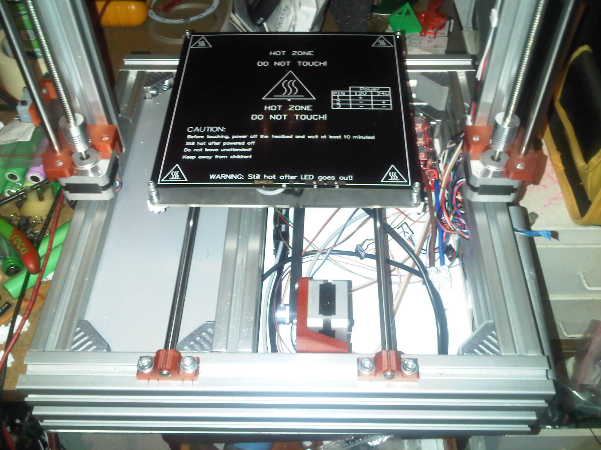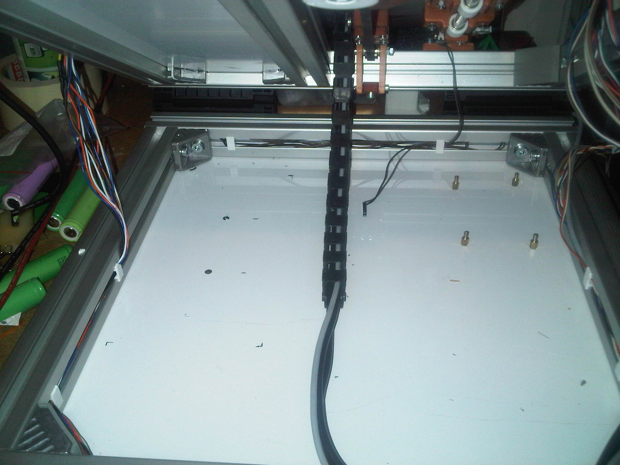 kabelaz k heatbedu ide tiez od spodku a pri zdvihnuti tlaciarne sa len jednoducho natiahne energoretaz a nic sa nedeje. ostatna kabelaz je zatial roztrusena. tiez sa nic nepohne, a vsetko ostava na svojom mieste, pretoze tlaciaren sa len zdvihne pod uhlom a nie kolmo.