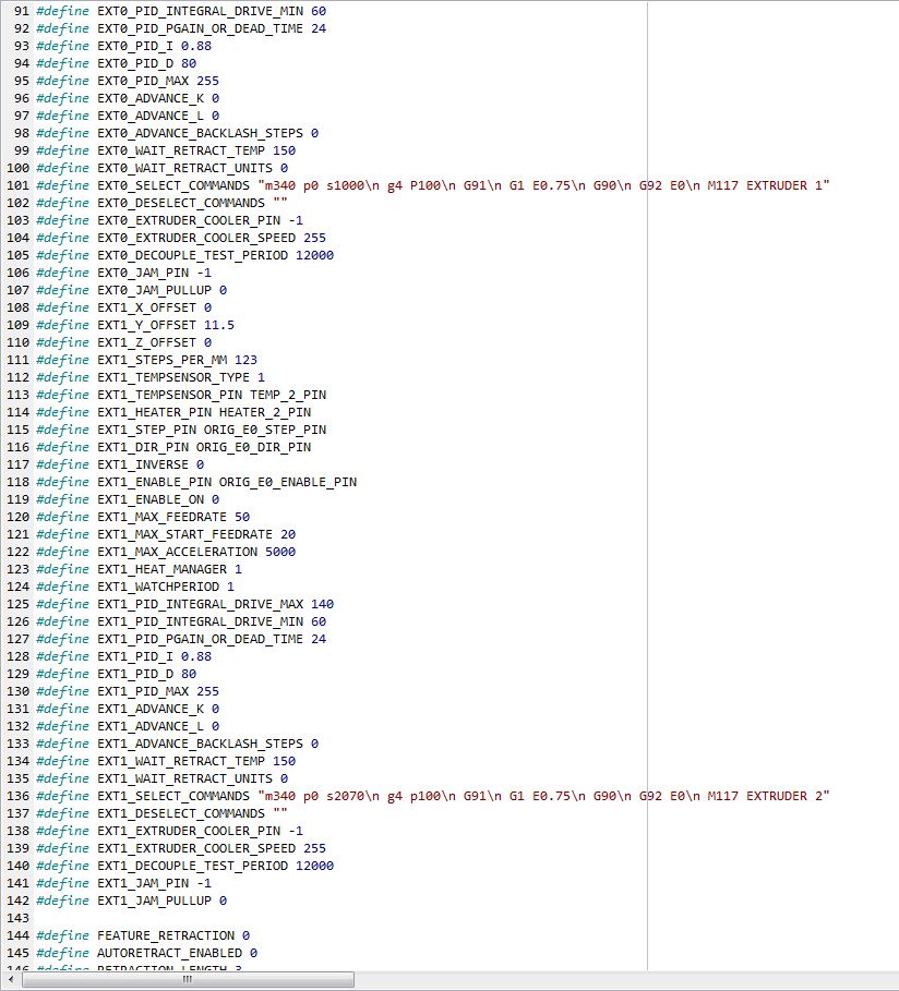 V slic3ru, tam akorát přidáš druhý extruder, v repetieru to samé, eeprom ten jsem já měnil, jelikož jsem tam měl napřed Marlina a přešel jsem na Repetier fw 0.92. V EEPROM akorát musíš nastavit vzdálenost mezi hotendy (ve sliceru bude 0mm jak u X tak u Y), velikost tiskové plochy a možná počet kroků na motoru extruderu.